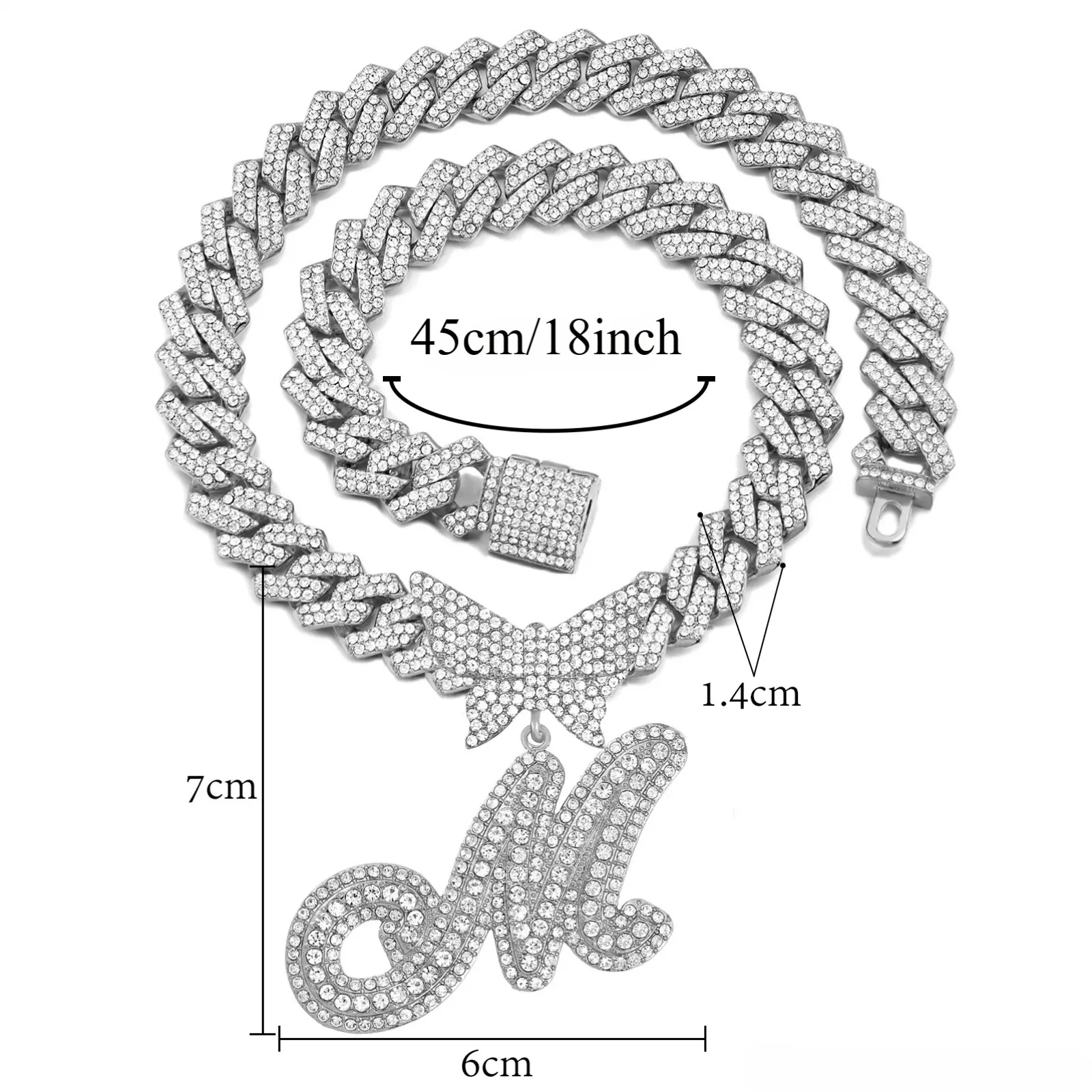 Iced Out Bling Butterfly Letter Pendant Necklace For Women AAA Rhinestone Paved Prong Cuban Chain Initial Necklaces Punk Jewelry
