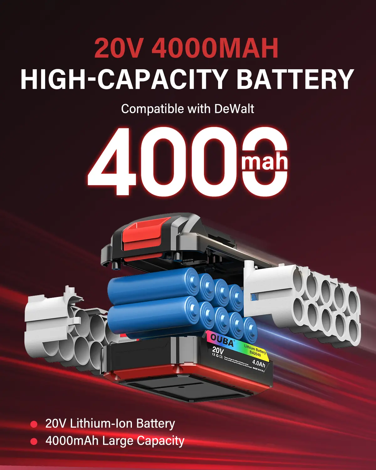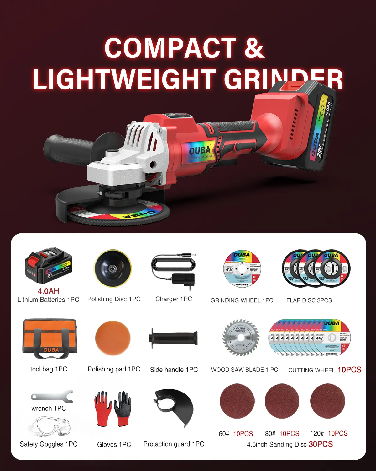 Cordless Convenience for Indoor & Outdoor Use: The OUBA cordless angle grinder, compatible with Dewalt 20V batteries, features a 20V 4.0Ah rechargeable battery for high-capacity power. Say goodbye to tangled cords and enjoy the freedom to work anywhere—indoors or outdoors. This cordless design offers unmatched portability and convenience, making it easy to carry and use for a wide range of tasks.