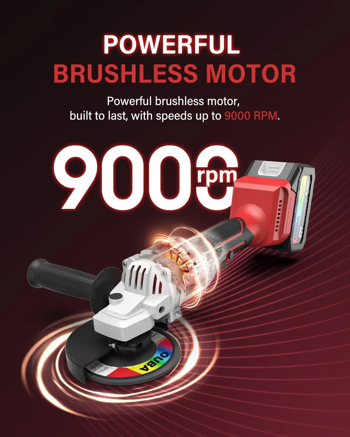 Impressive Power with 9000 RPM: The OUBA 20V angle grinder features a brushless motor delivering up to 9000 RPM, perfect for grinding metal, removing rust, cutting metal/steel, and polishing. The high-power brushless motor offers a longer lifespan, greater efficiency, less battery drain, reduced noise, and safer operation—ensuring top performance with every use.