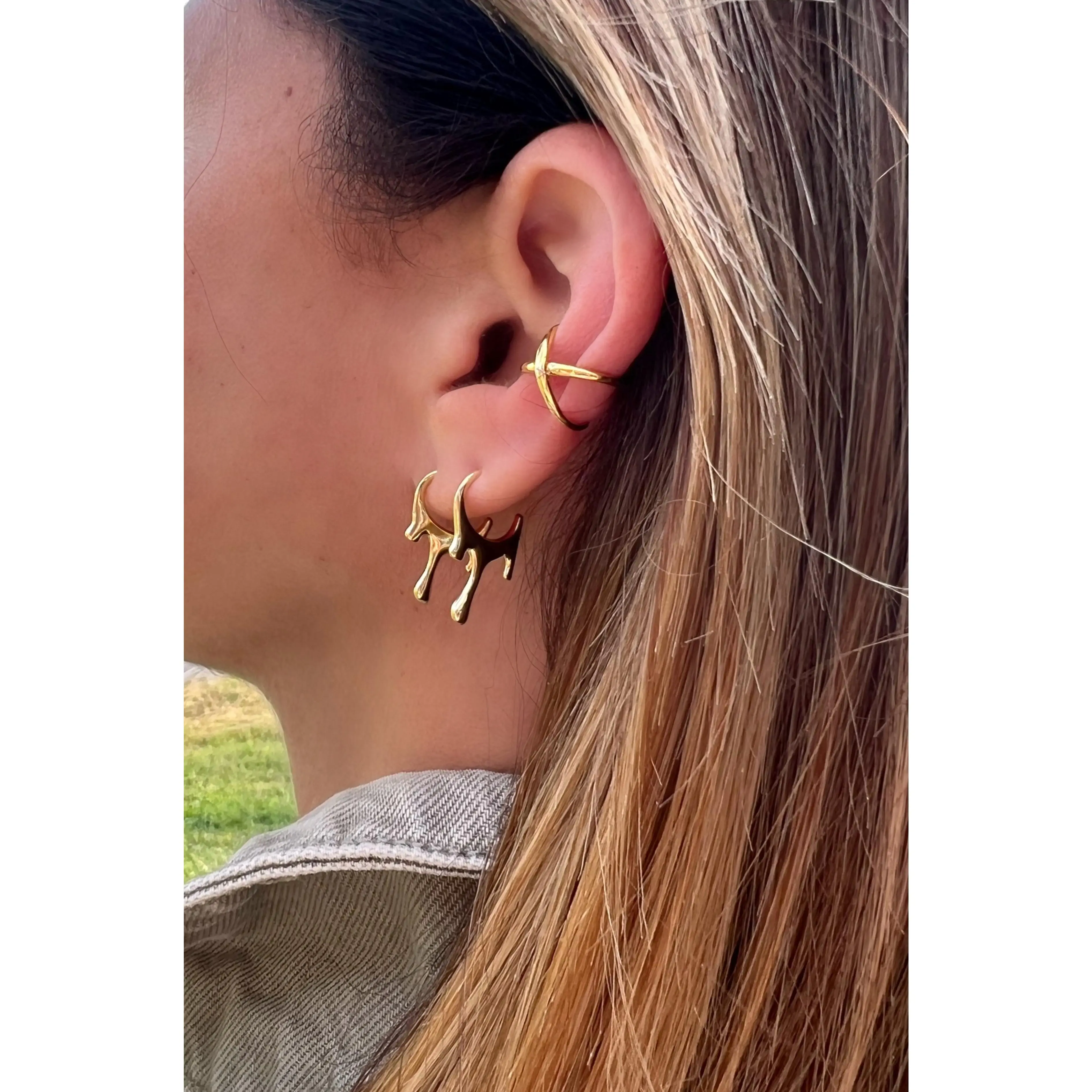 This gold dripping hoop is a versatile addition to your jewelry collection, perfect for adding a touch of elegance to your look.