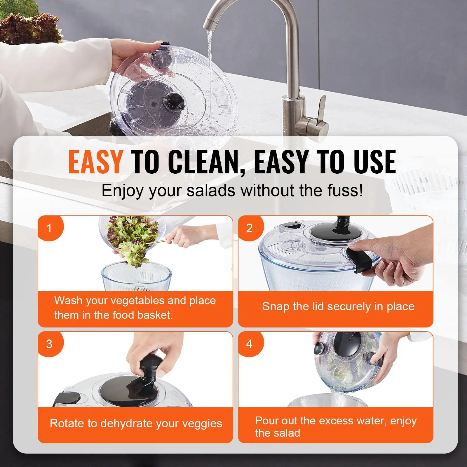 • Effortless Cleaning Made Simple: Experience the ease of cleaning with our fruit spinner! Just wash your veggies, place them in the food basket, snap the lid shut, and give it a quick spin. For a thorough cleanup, you can easily detach the top and toss it in the dishwasher. No more scrubbing or soaking - it's a breeze to keep your vegetable spinner dryer sparkling clean.