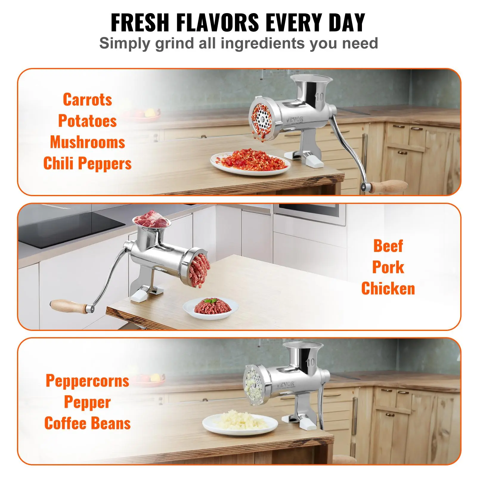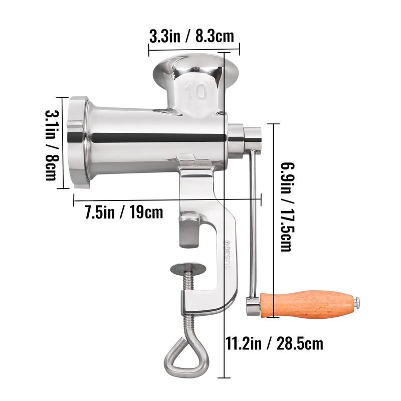 • Food-Grade Stainless Steel: All parts of our manual meat grinder are made of food-grade stainless steel, which provides excellent rust and corrosion resistance and contributes to its stylish appearance. With this high-quality material, this machine offers you a healthy and secure method to ensure your food remains hygienic while cutting down maintenance costs.