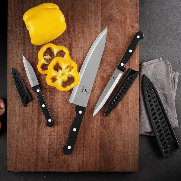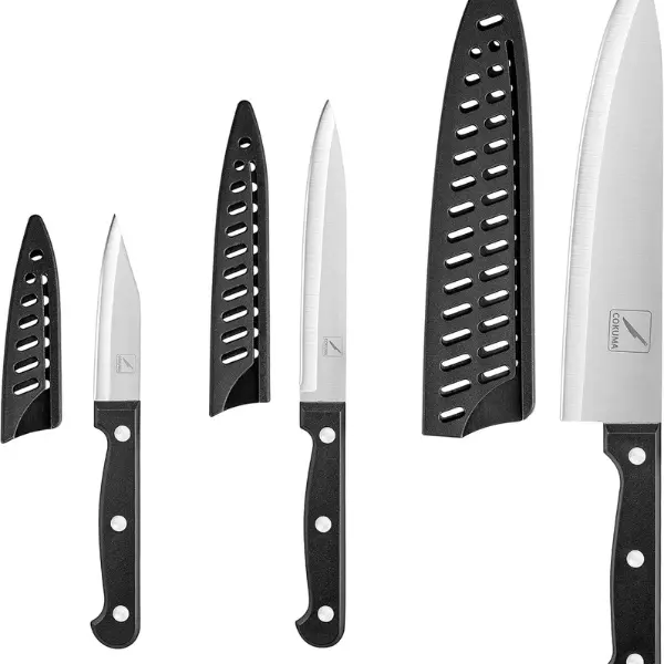 This 3-piece kitchen knife set from Cokuma includes essential knives for everyday food preparation, all crafted from premium German steel for precision and durability. With an ergonomic handle for comfort and matching knife sheaths for safe storage, this set is designed to meet both home and professional kitchen needs.