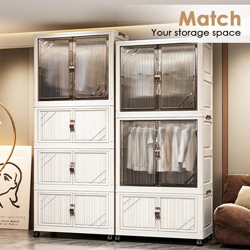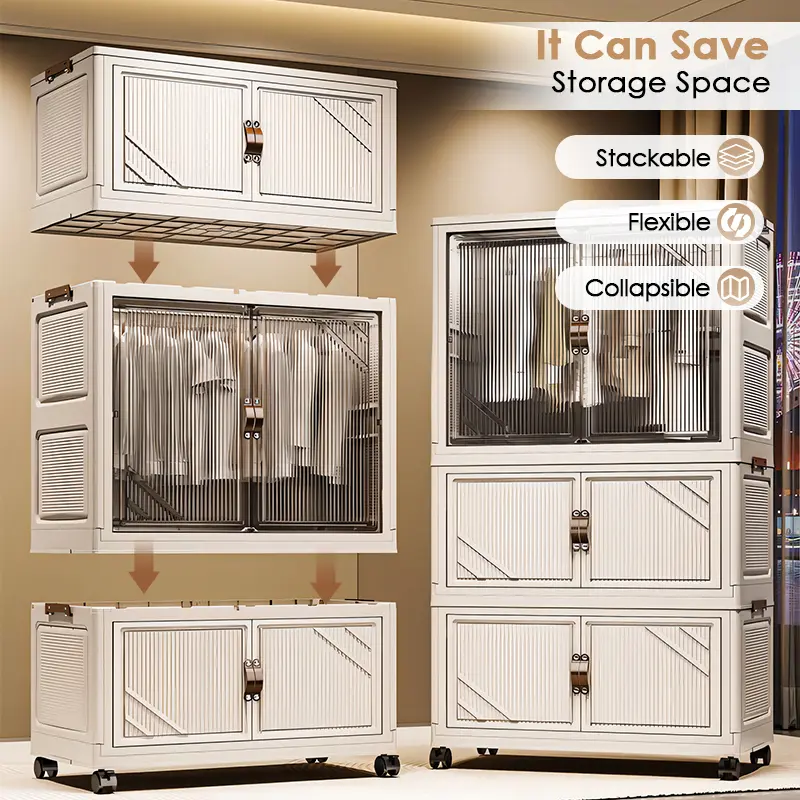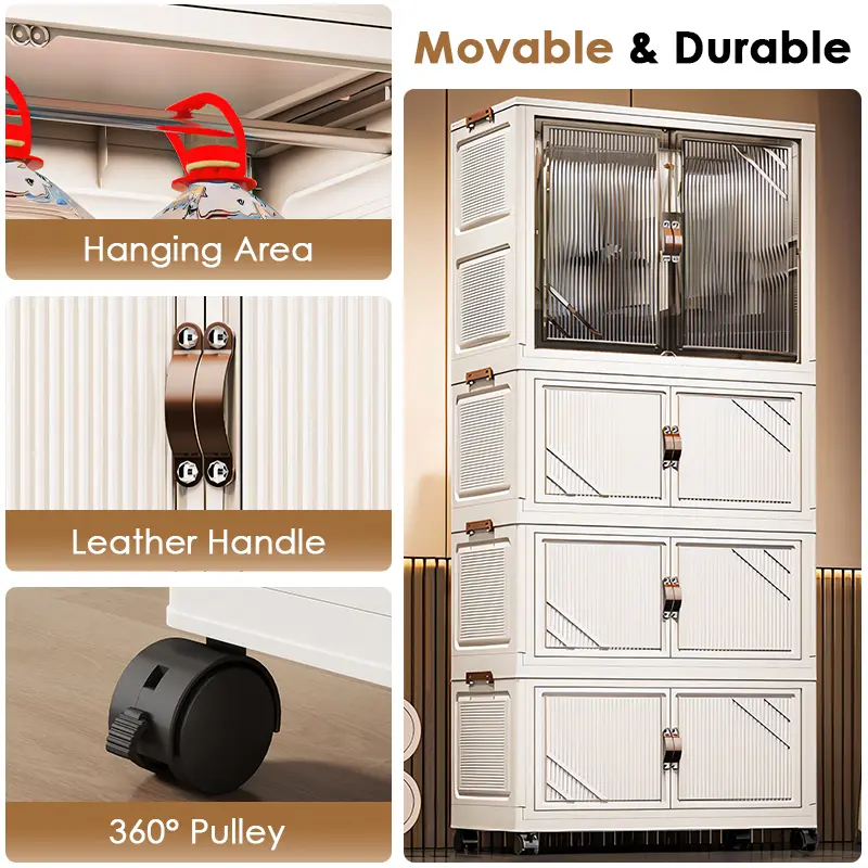 Portable Closet Wardrobe, Folding Storage Bins with Lid, Closet Organizers and Storage, Stackable Storage Box with Hanging Rod and Doors, Collapsible Plastic Clothes Cabinet with Wheels