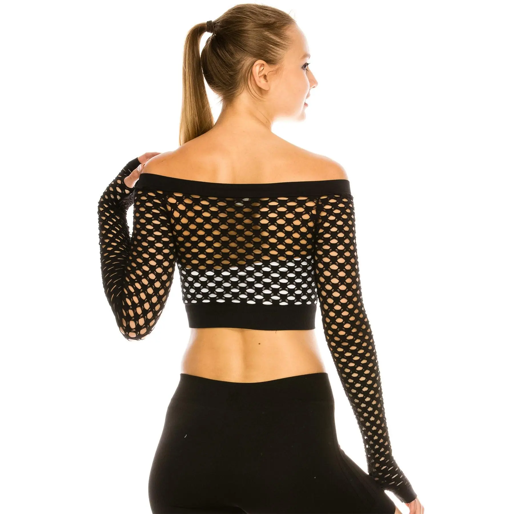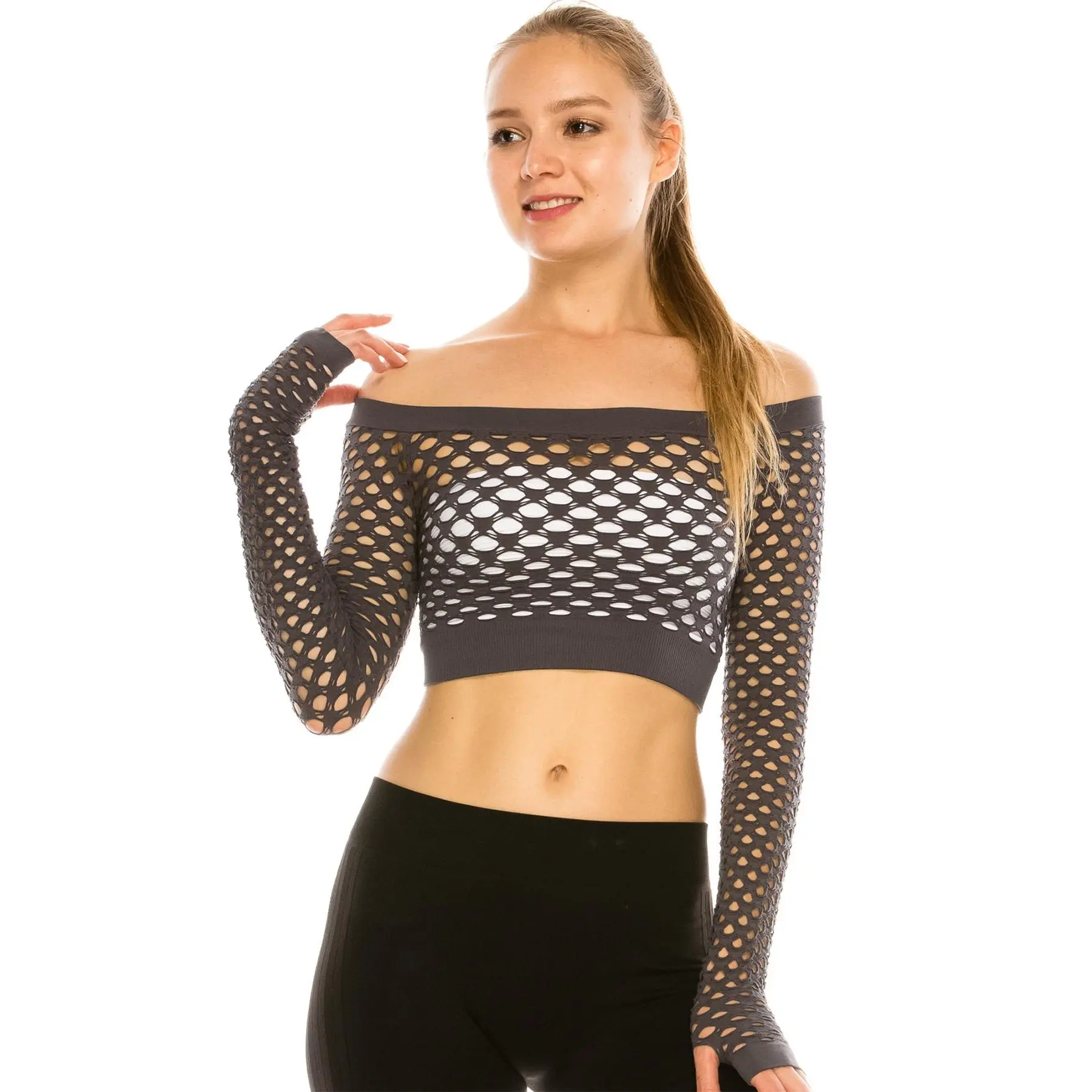 Turn heads with the KURVE Butter Soft Seamless Crop Fishnet Top, a must-have piece that elevates any wardrobe with its edgy charm.