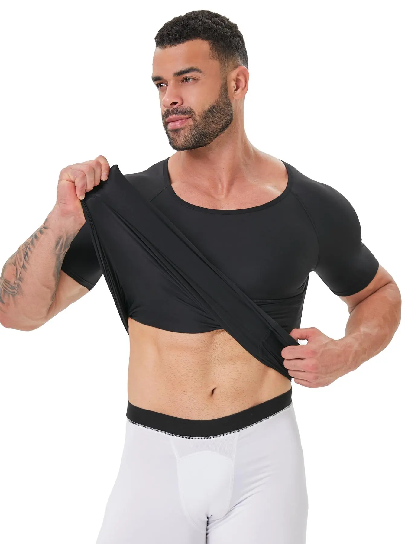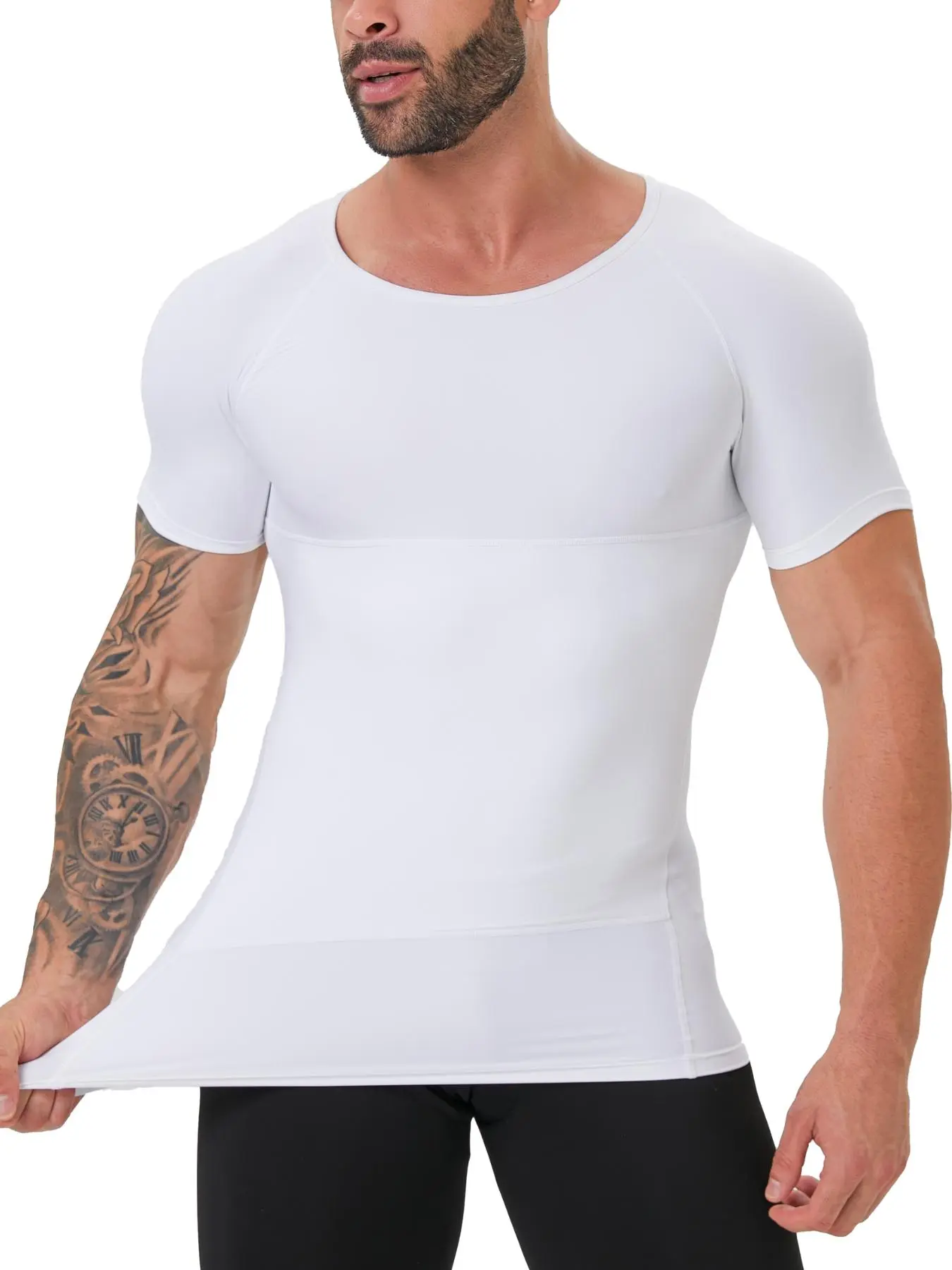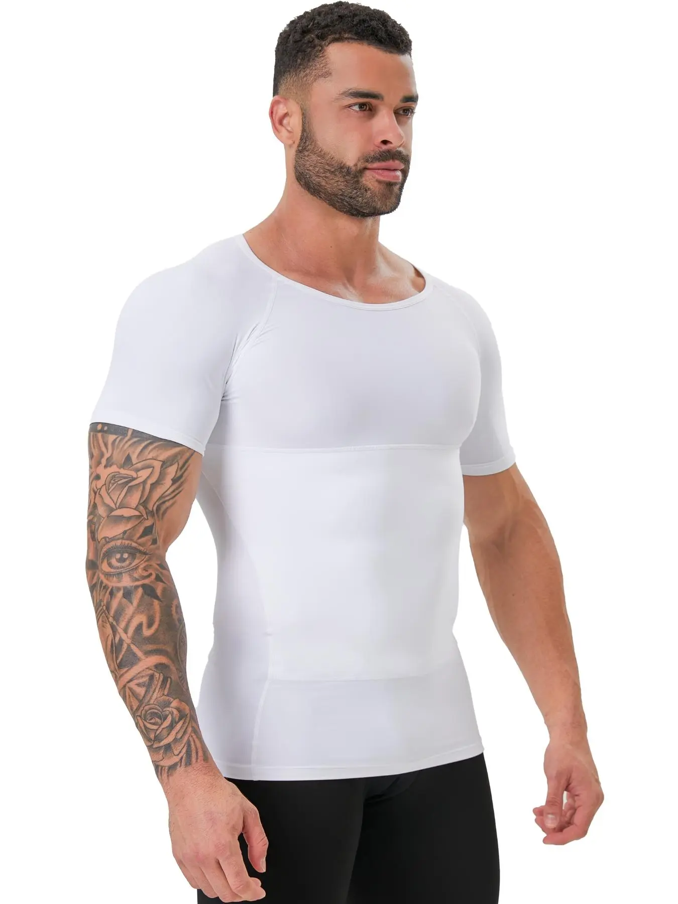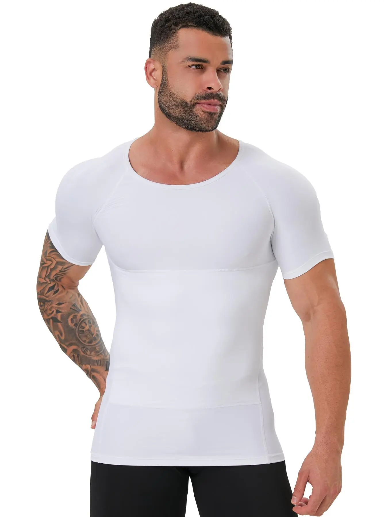 TUMMY CONTROL - Our men’s body shaper with double-layer on the belly for more compression and flattens your stomach instantly. The white compression shirts for men are the perfect match under any shirt, suit, and coat.