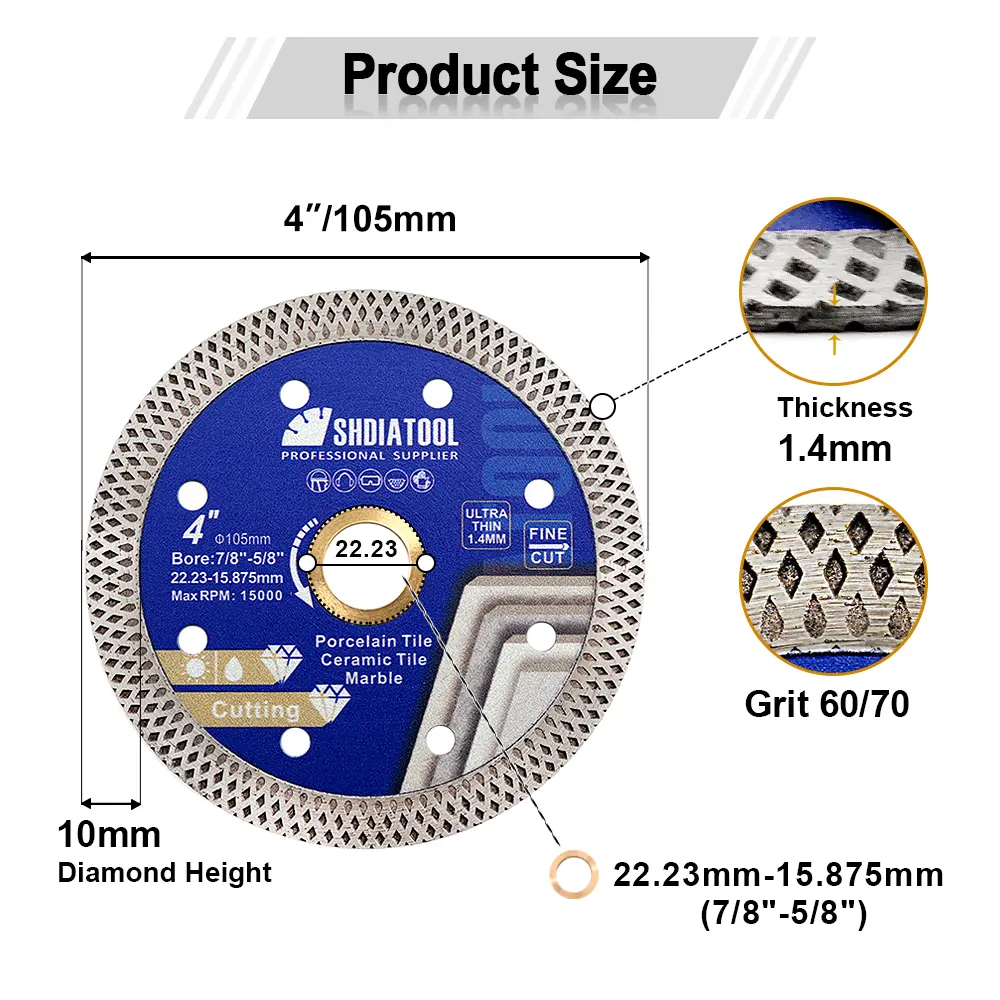 Special Design: Super Thin X Turbo Segments provide chip free and fast cutting. Reinforced ring core on both side of blade, make cutting more stable and get better finishing. Hot-pressed sintered blade with very high quality diamond grain provide long working life.