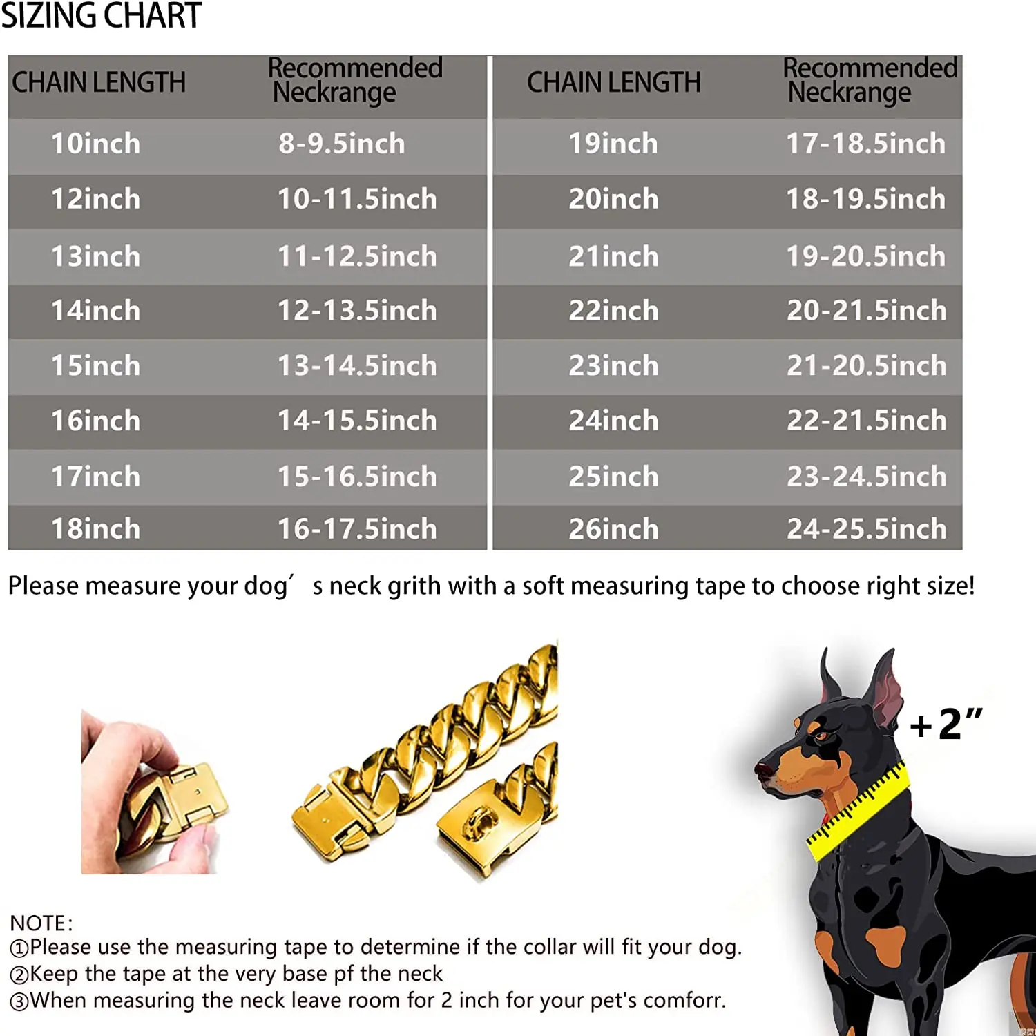 ·🦮Size: cuban link dog collar is 32 mm (1.26 inches) wide, the thickest of the chain dog collar. Length is 16 ~ 26 inches. Medium size (16 ~ 22 inches); and large size (24 ~ 26 inches). Please note: Please use a measuring tool to measure the dog's neck where you wish to place the collar, then add about 1 to 2 inches.