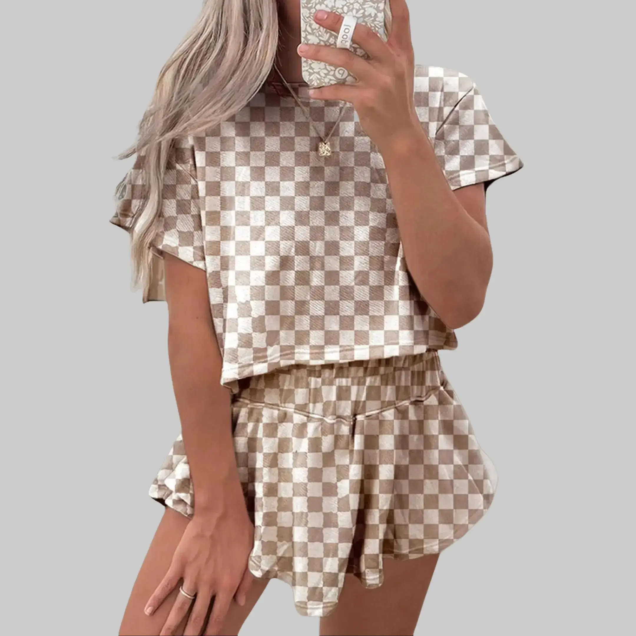 Women's Checkerboard T-Shirt & Ruffle High Waist Skort Set 2026 Summer Casual Breathable Fabric Two-Piece Outfit for Daily Wear Chic Crewneck