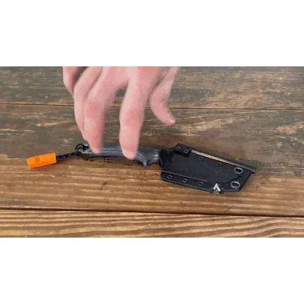 COMBUSTION: Throw generous sparks by striking the 90-degree spine against the hex-shaped, threaded ferrocerium rod integrated into the sheath.