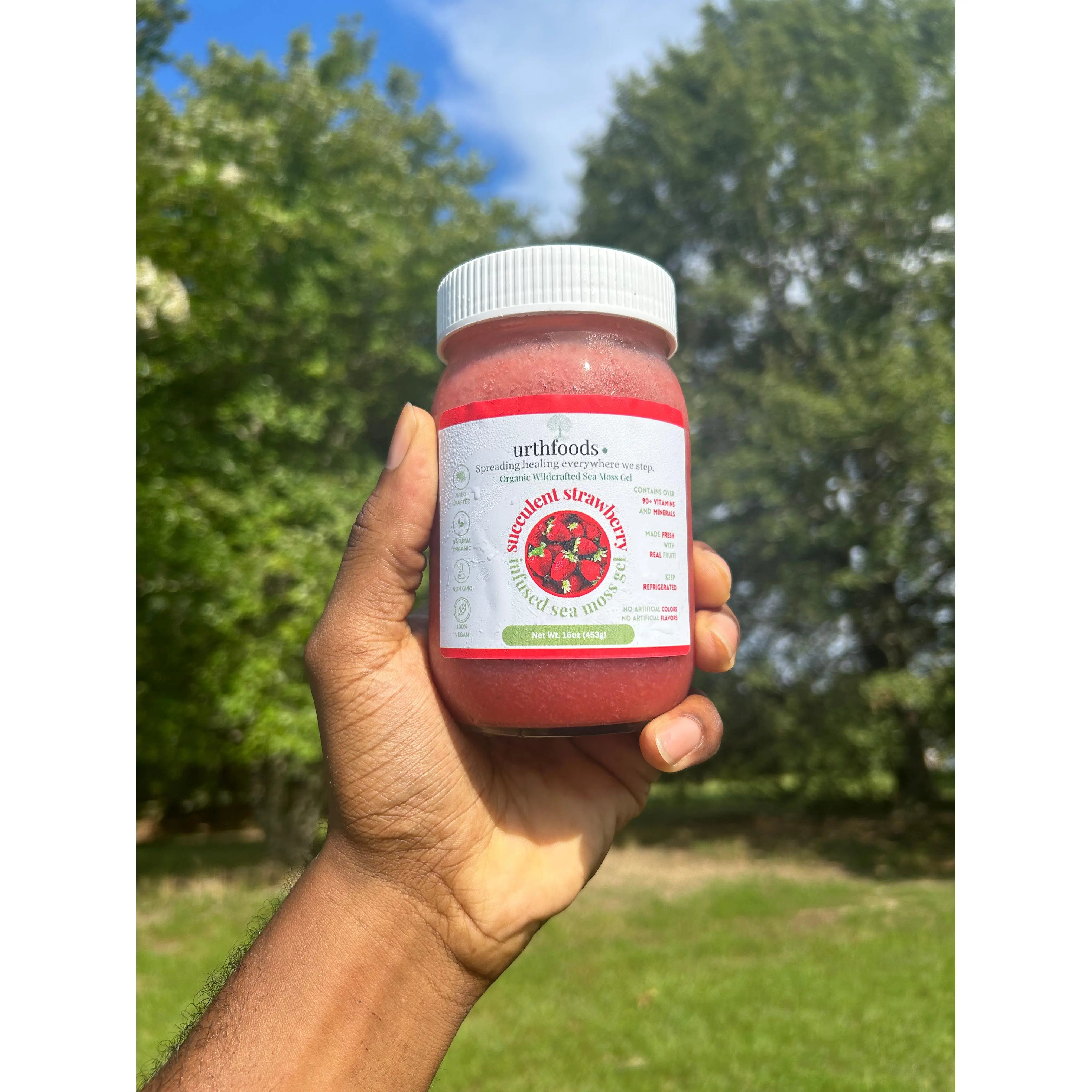 Wildcrafted Organic Sea Moss Gel, Strawberry, Agave, Alkaline Spring Water, and Lime.