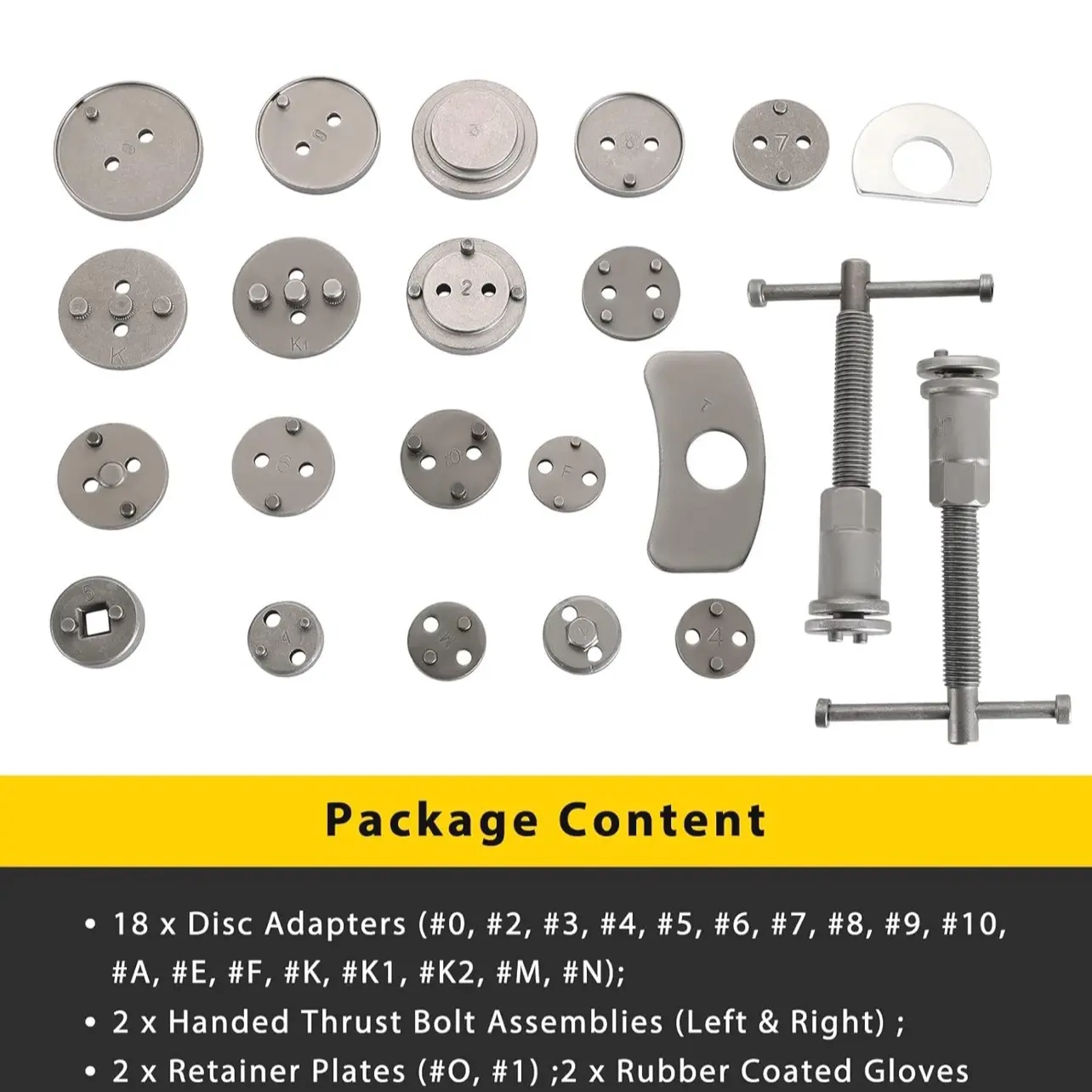 * Complete Caliper Compression Tool Kit: Includes right and left handed thrust bolts, 2 retaining plates, 18 disc adapters, 1 pair of gloves, and a convenient carry case for secure storage.