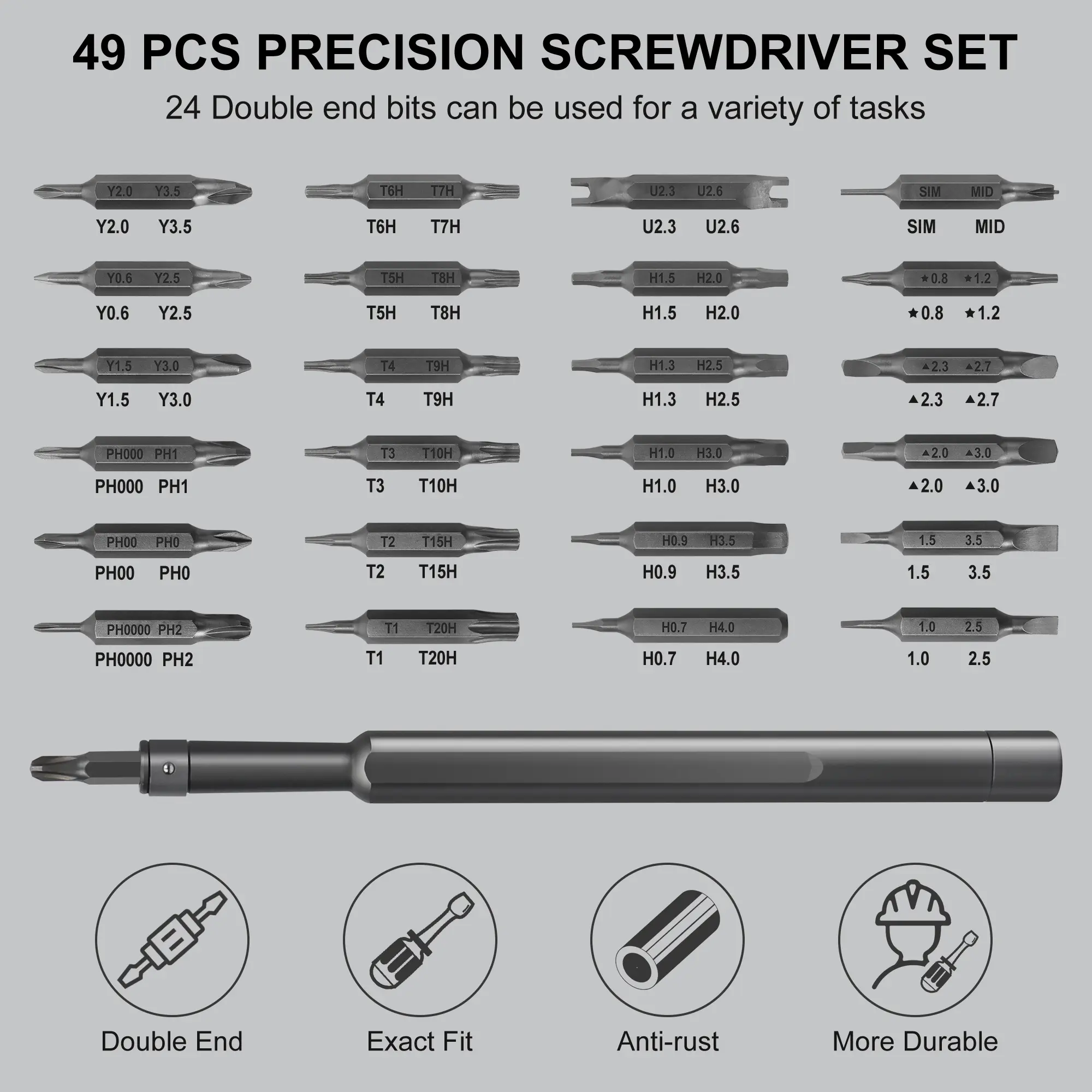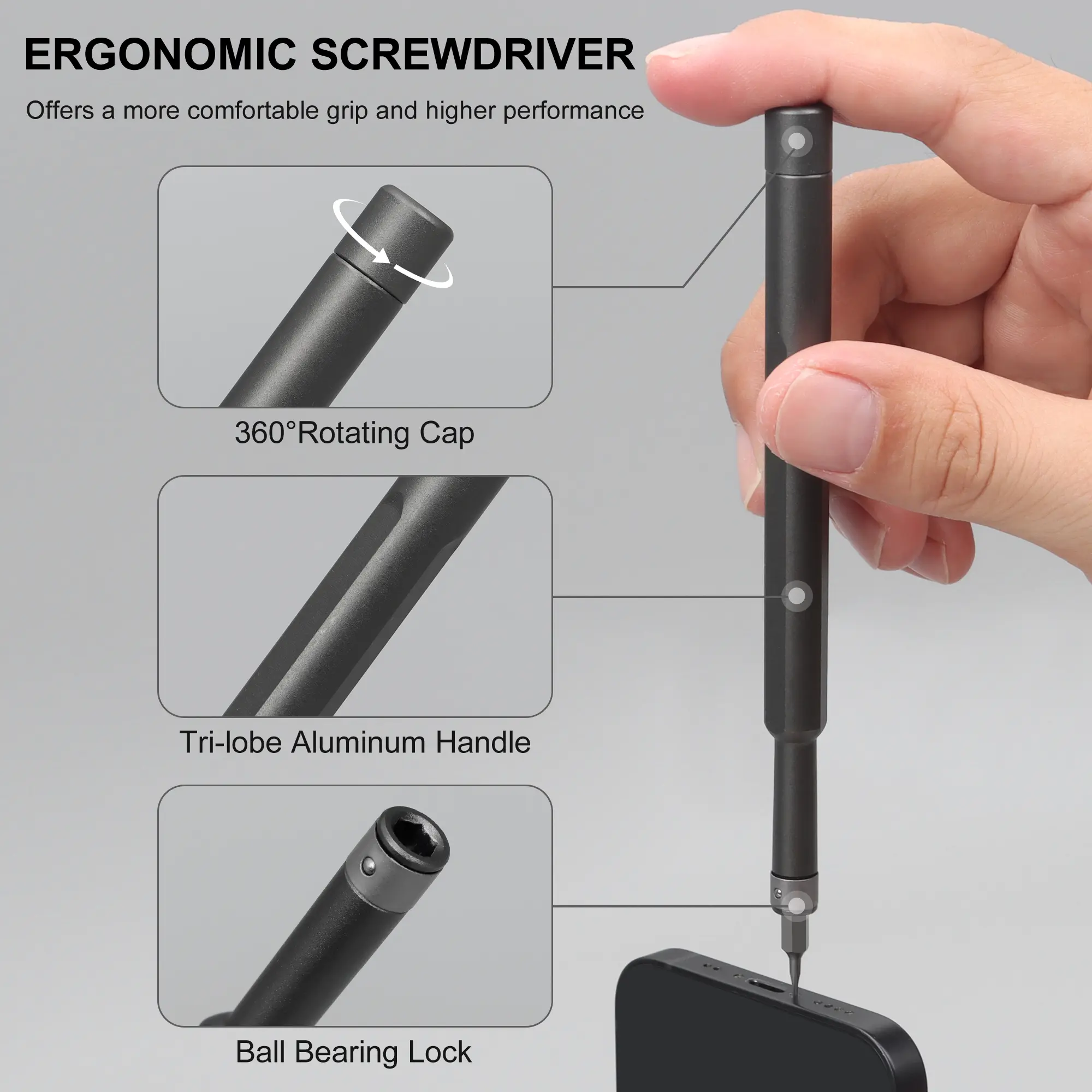 ·【Secure Bit Holder】Our precision screwdriver's bit holder is equipped with a ball bearing lock to keeps bits firmly in place, delivering the precision your job requires. Additionally, the built-in magnet transmits magnetism through the tip, allowing you to easily attract and prevent loss of tiny screws
