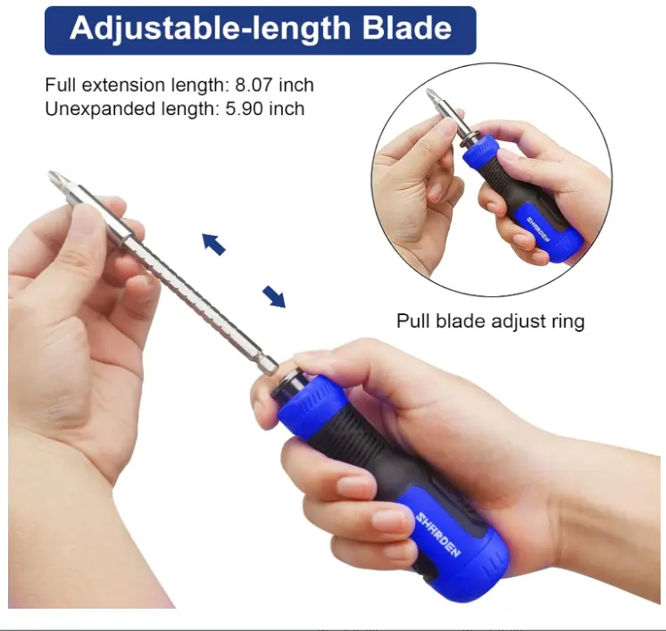 ·【Adjustable Design】This screw driver set Includes a 4.53" extension shaft which is made from alloy steel, great for working in hard-to-reach areas. Press the adjust ring and extend the length for easier access. The impact rated blade can be removed and attached to power tool, gives you more possibility