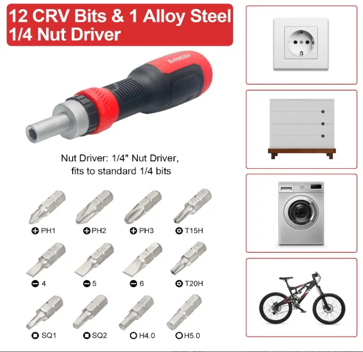 ·【Space Saver】Ratcheting screwdriver set stores 12 changeable tips in the handle with an integrated bit holder. It's convenient to screw off the end cap and switch the bits. The screw driver handle is 5.90" length, takes up very little space, fits into pocket, also suit for EDC, kitchen drawer, tool belt, tool box or backpack