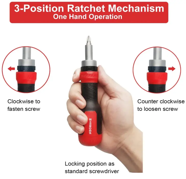 ·【Ratcheting Mechanism】Ratcheting screwdriver breaks through the limitations of the direction, convenient switch for clockwise(fastening) and counter clockwise(loosening) ratcheting and locking position(as standard multi-bit screwdriver), saves time and effort, enables easier all-day driving