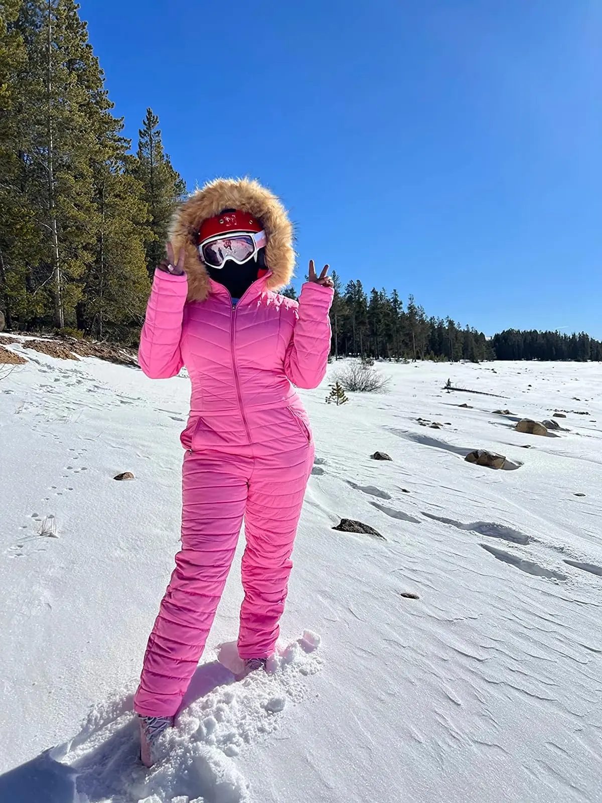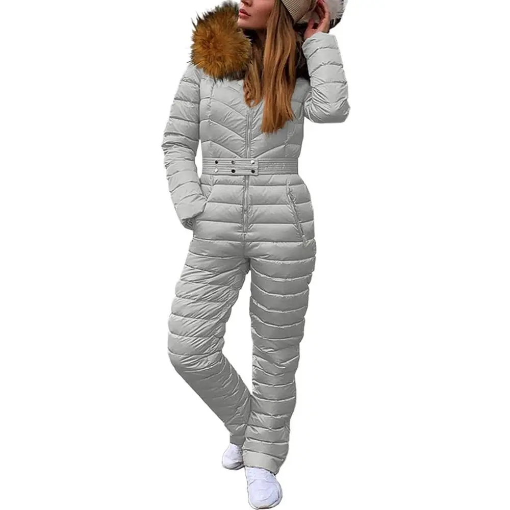 Details: New Winter Hooded Jumpsuits Cotton Padded Warm Sashes Ski Suit Straight Zipper One Piece Casual Tracksuits with Pockets. Removable big faux fur trim and warm protect the whole body.With belt.