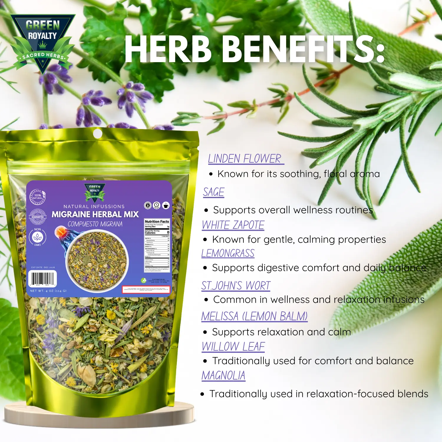 Green Royalty Herbal Mix Migraine Medicinal Tea - Herbal Blend for Migraine Relief - Beverage