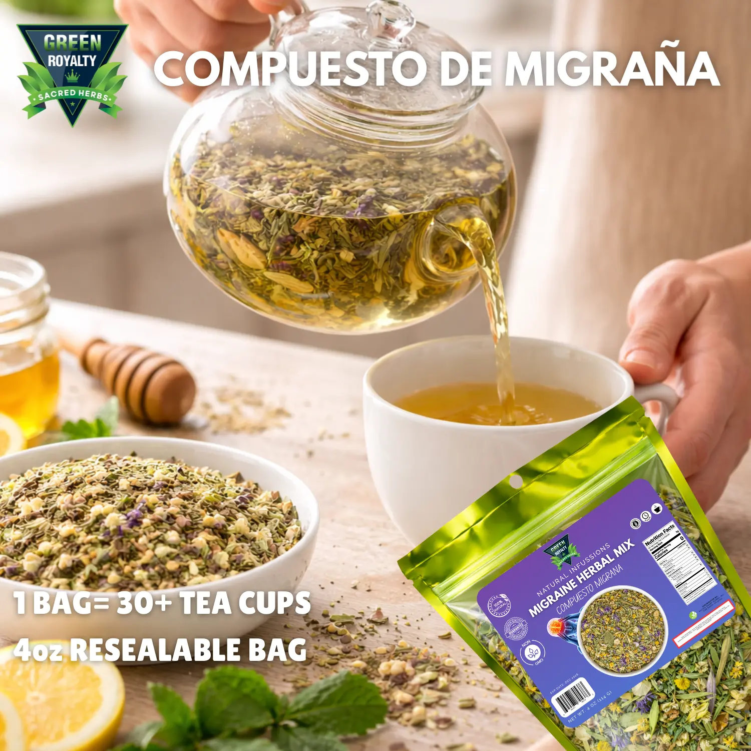 Discover the Green Royalty Herbal Mix Migraine Medicinal Tea, a delightful blend designed to help alleviate migraine pain. This herbal tea is crafted to provide effective relief for those suffering from migraines. 🌿