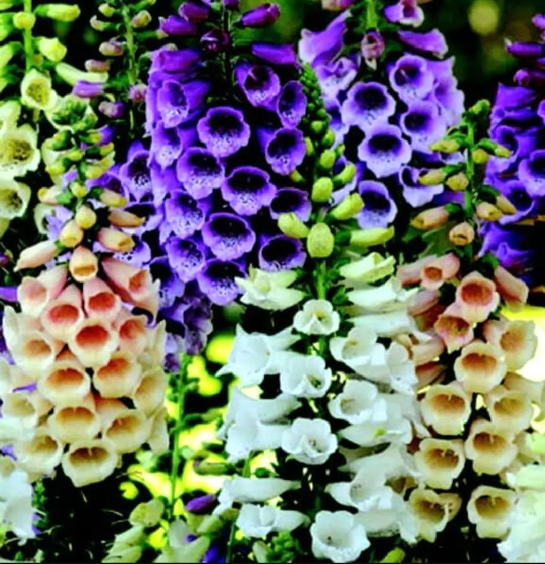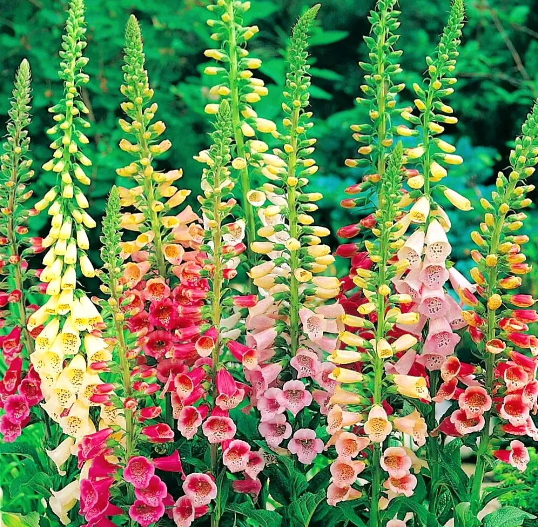 Foxglove each plant produces several tall, stately flower spikes, The individual florets are spotted inside and come in an array of soft colours. The tubular flowers hang from tall green spikes and are very eye-catching.