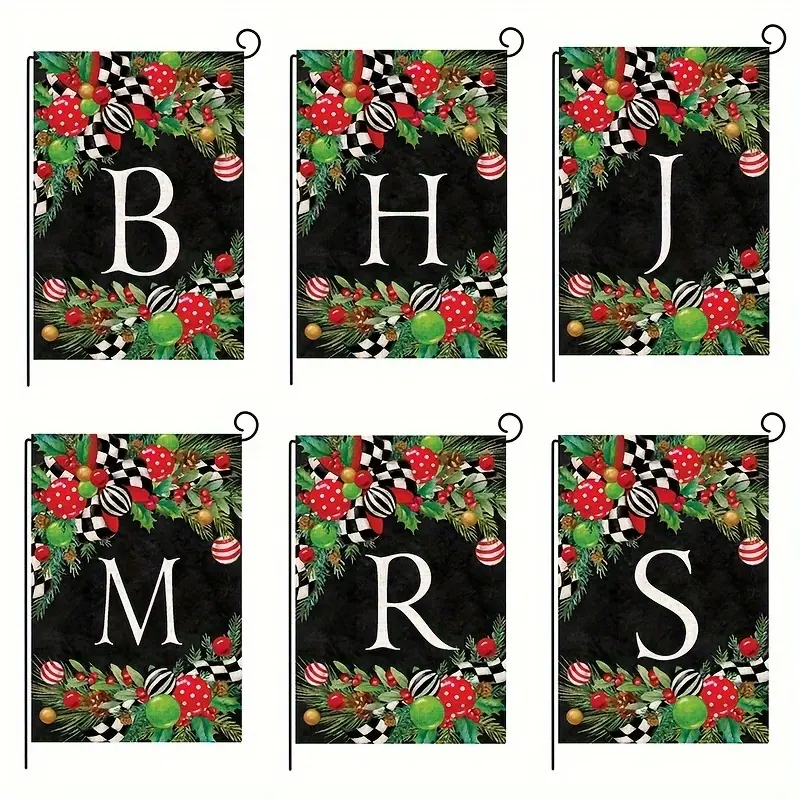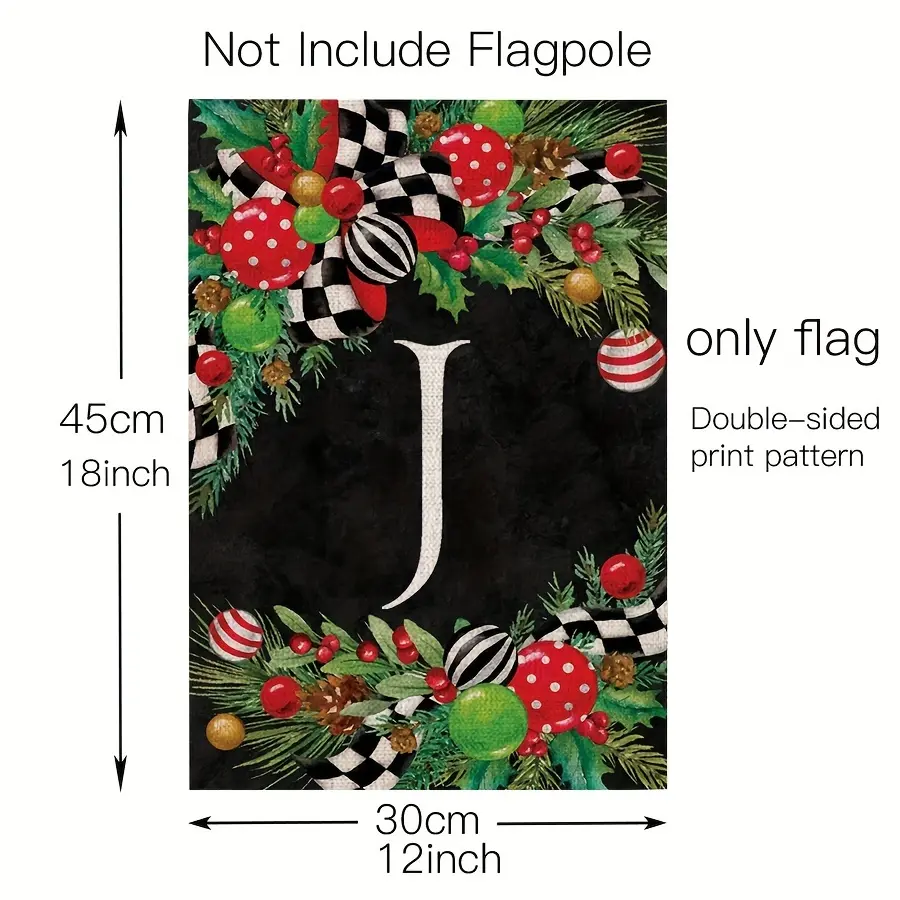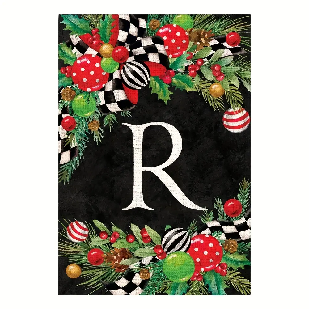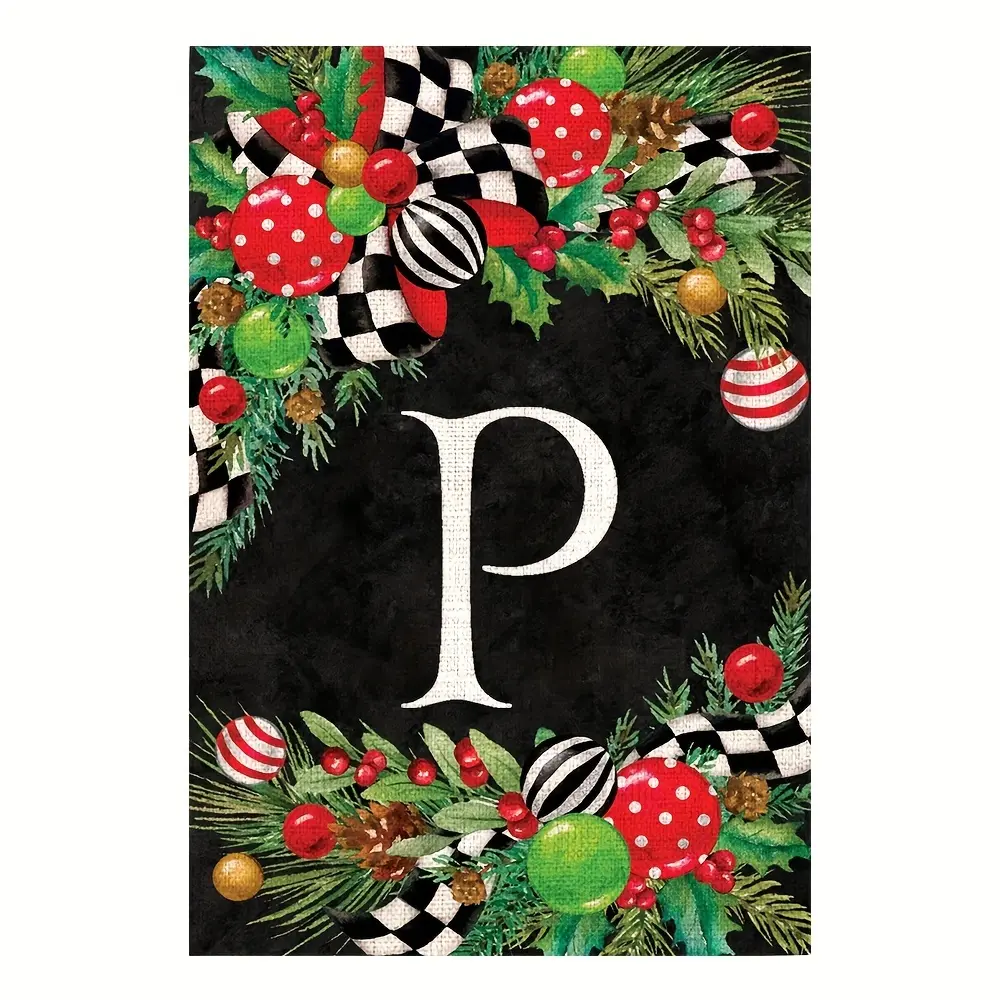 Linen Christmas Monogram Letter Garden Flag - Initial Personalized Family Name Yard Banner Sign,Double-Sided Print, Festive Holiday Outdoor Decoration, Yule Holly Design, No Flagpole Included Ornaments