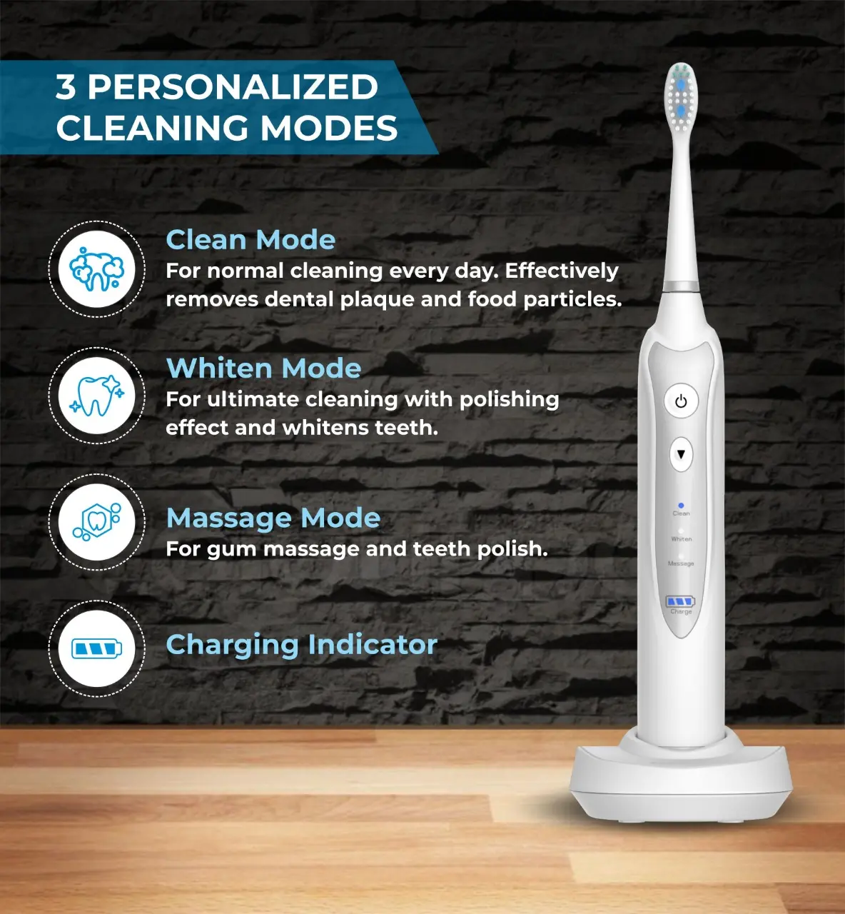 ·THREE CLEANING MODES FOR COMPREHENSIVE CLEANING: This toothbrush quickly adapts to the different types of cleaning requirements with its three distinct cleaning modes; Clean, Whiten, and Massage. This battery powered toothbrush deep cleans your teeth and gums and removes all kinds of stains and plaque. Get a shining smile and raise your confidence.