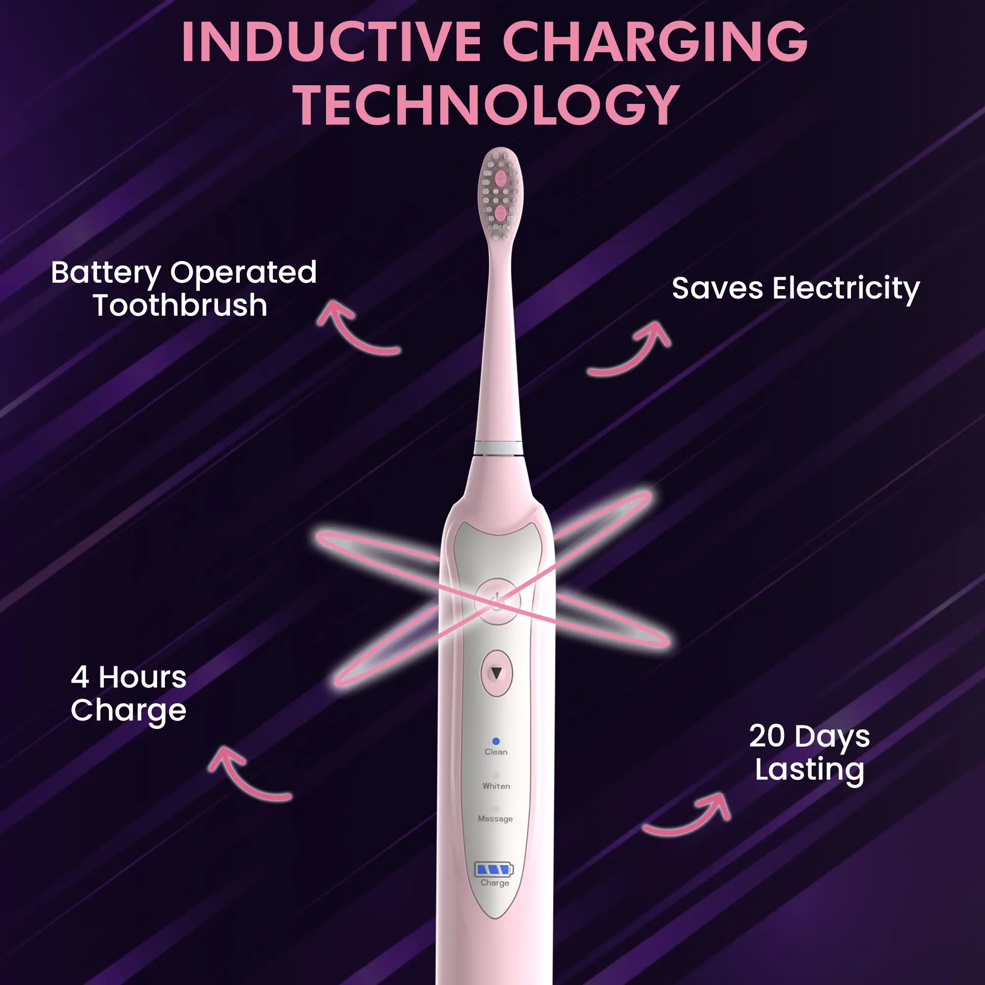 ·LONG BATTERY-LIFE, EXPEDIENT INDUCTIVE CHARGING: Get superb cleaning of your teeth and gums with a sonic toothbrush. Progressively improve your gum health with this long battery-life automatic toothbrush. Experience hassle-free charging comfort with the ingenious inductive charging technology that charges up your toothbrush without any wire. This battery operated toothbrush is more eco-friendly, saves electricity, and is worth your money. Longer than any other rechargeable travel toothbrush.