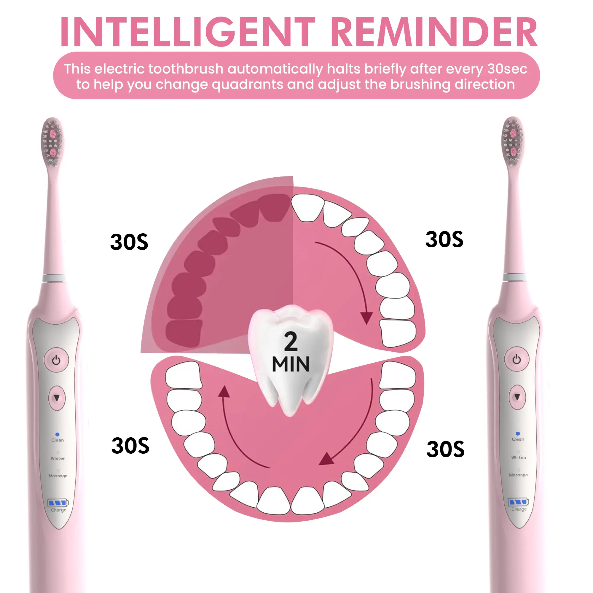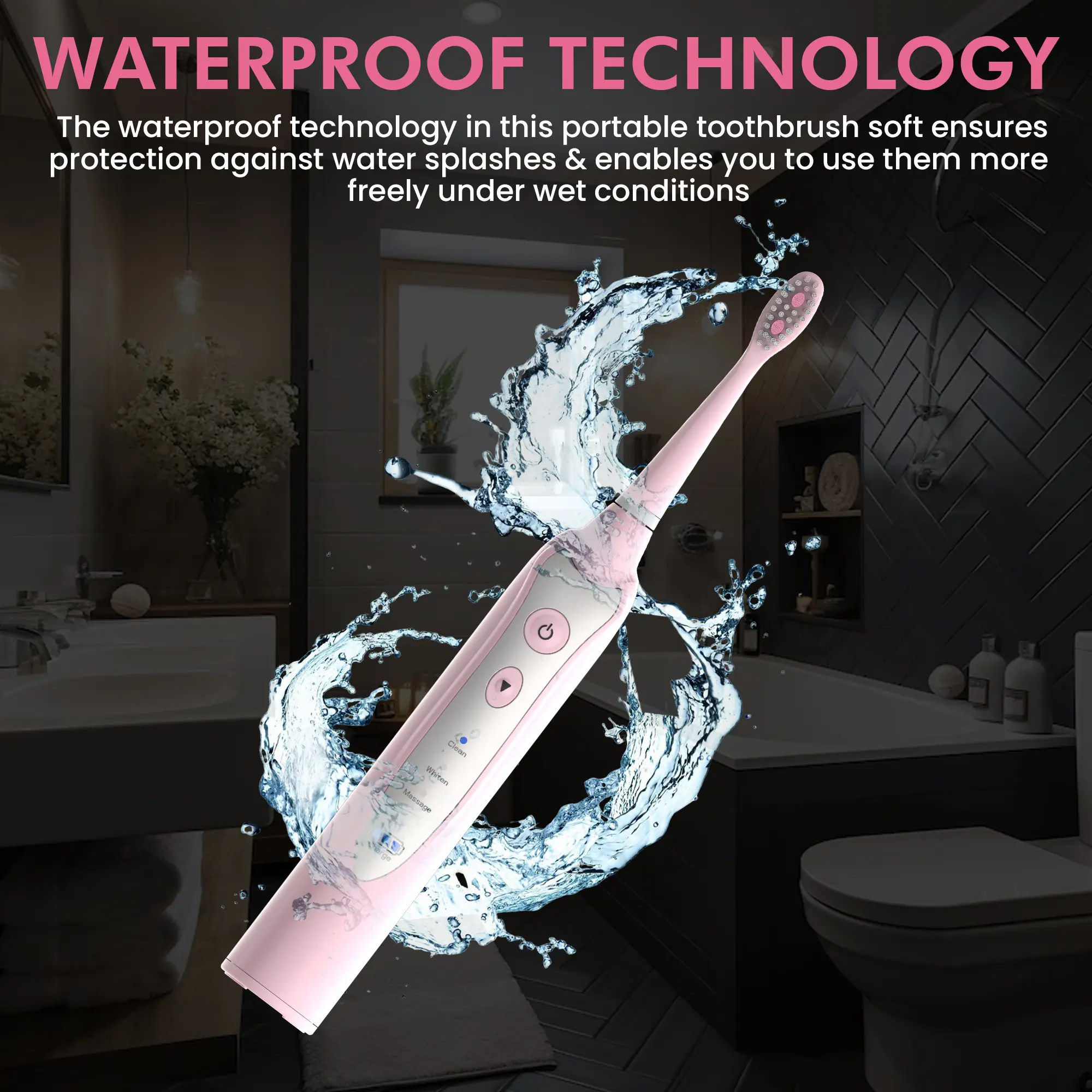 ·INTELLIGENT REMINDER, WATERPROOF TECHNOLOGY: Smart 30-second reminder. This electric toothbrush automatically halts briefly after every 30 seconds to help you change quadrants and adjust the brushing direction. The waterproof technology in this portable toothbrush soft ensures protection against water splashes and enables you to use them more freely under wet conditions. Waterproof, Battery toothbrush for adults with an ergonomic and no-slip handle.