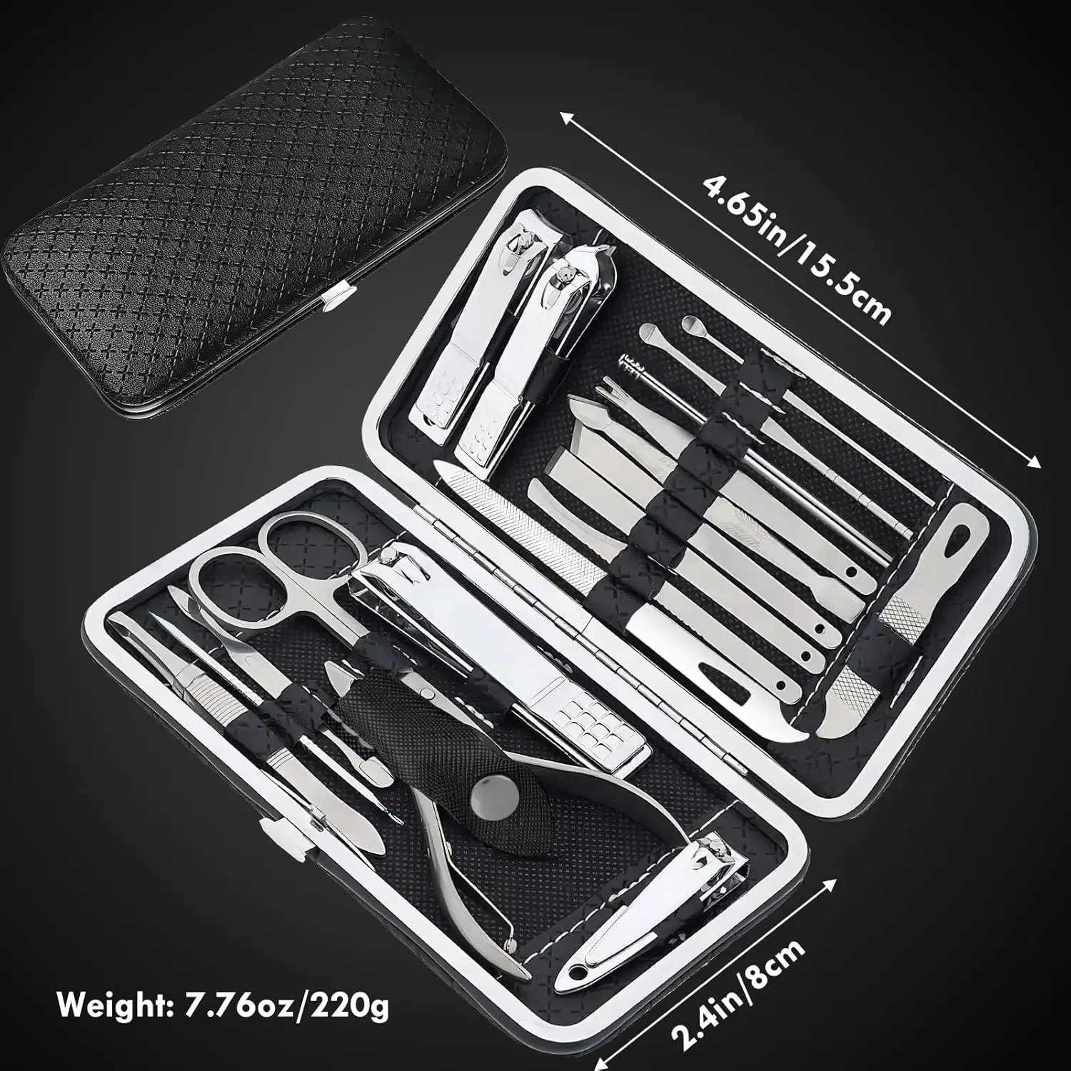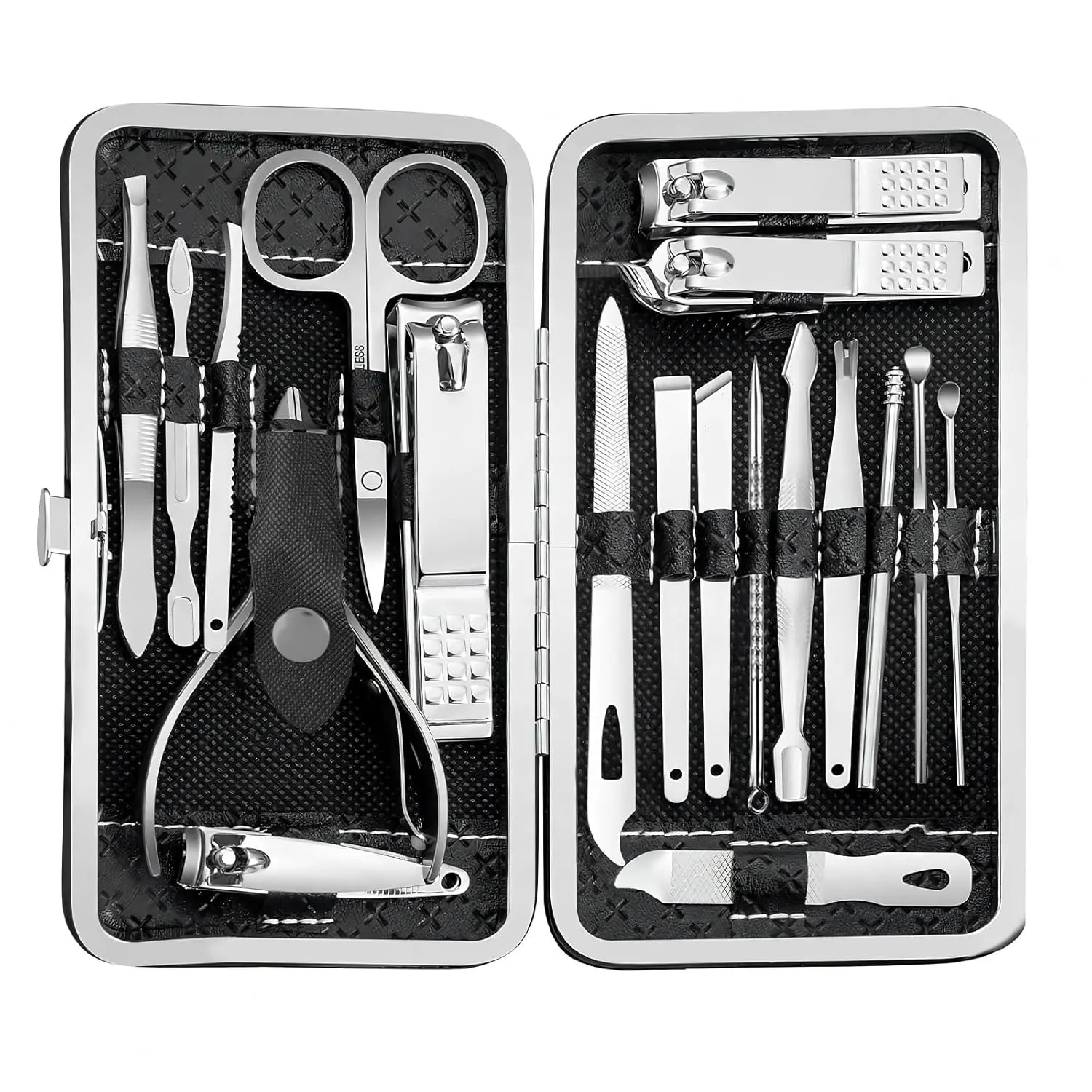 The set includes 19 tools like nail clippers, tweezers, and cuticle cutters, ensuring a complete grooming experience. Each tool is specifically designed for precision and ease of use in personal care.
