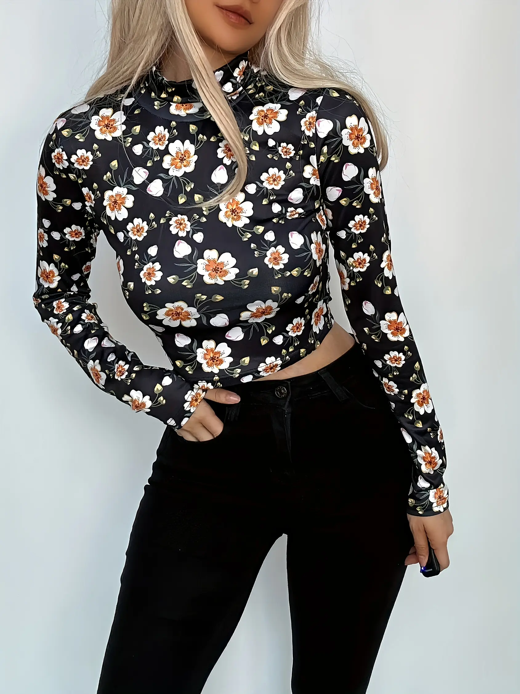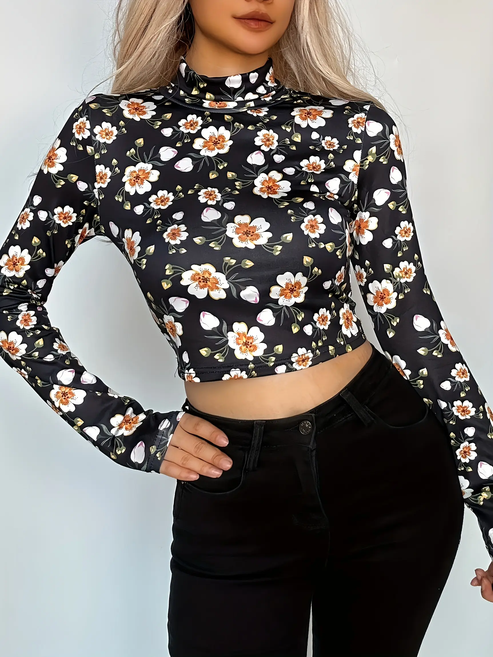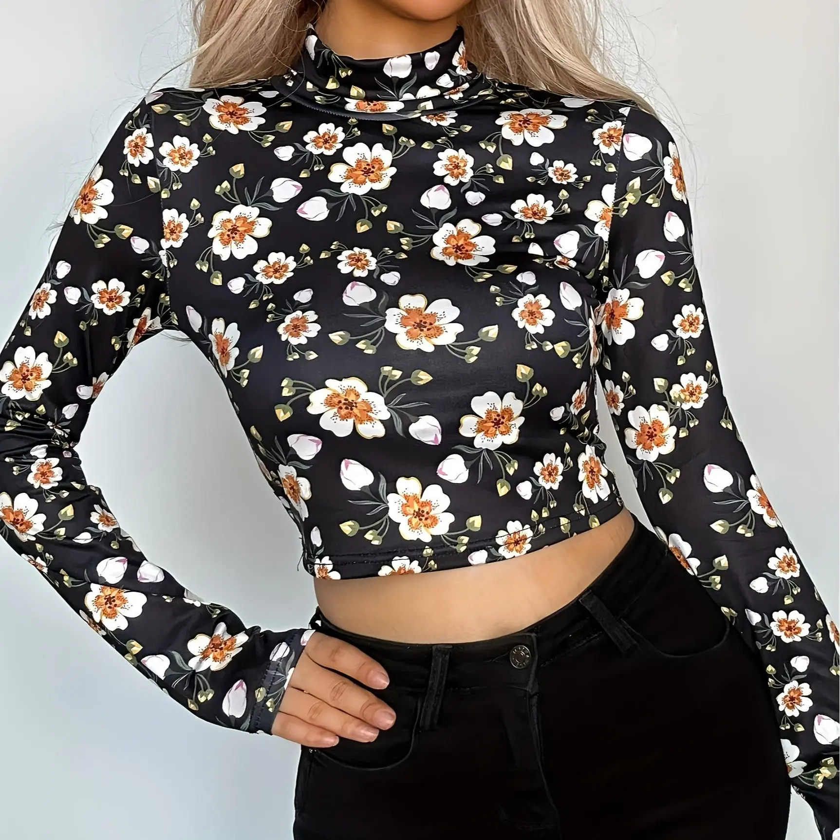 Floral Print High Collar Top, Long Sleeve One Piece T-shirt, Women's Clothing for all Seasons-XSY713