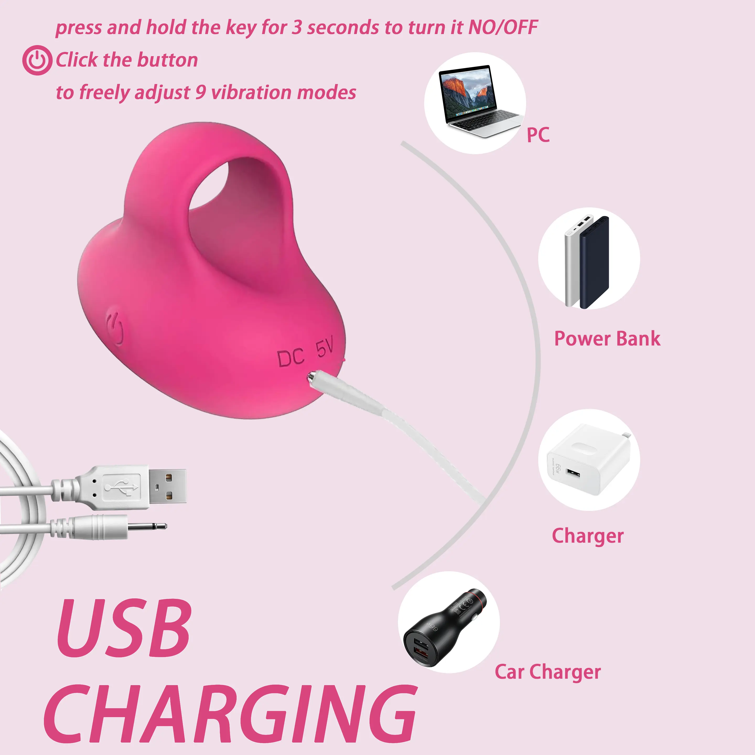 1. Long press the button for 3 seconds to switch on/off, short press to switch between 9 vibration modes.