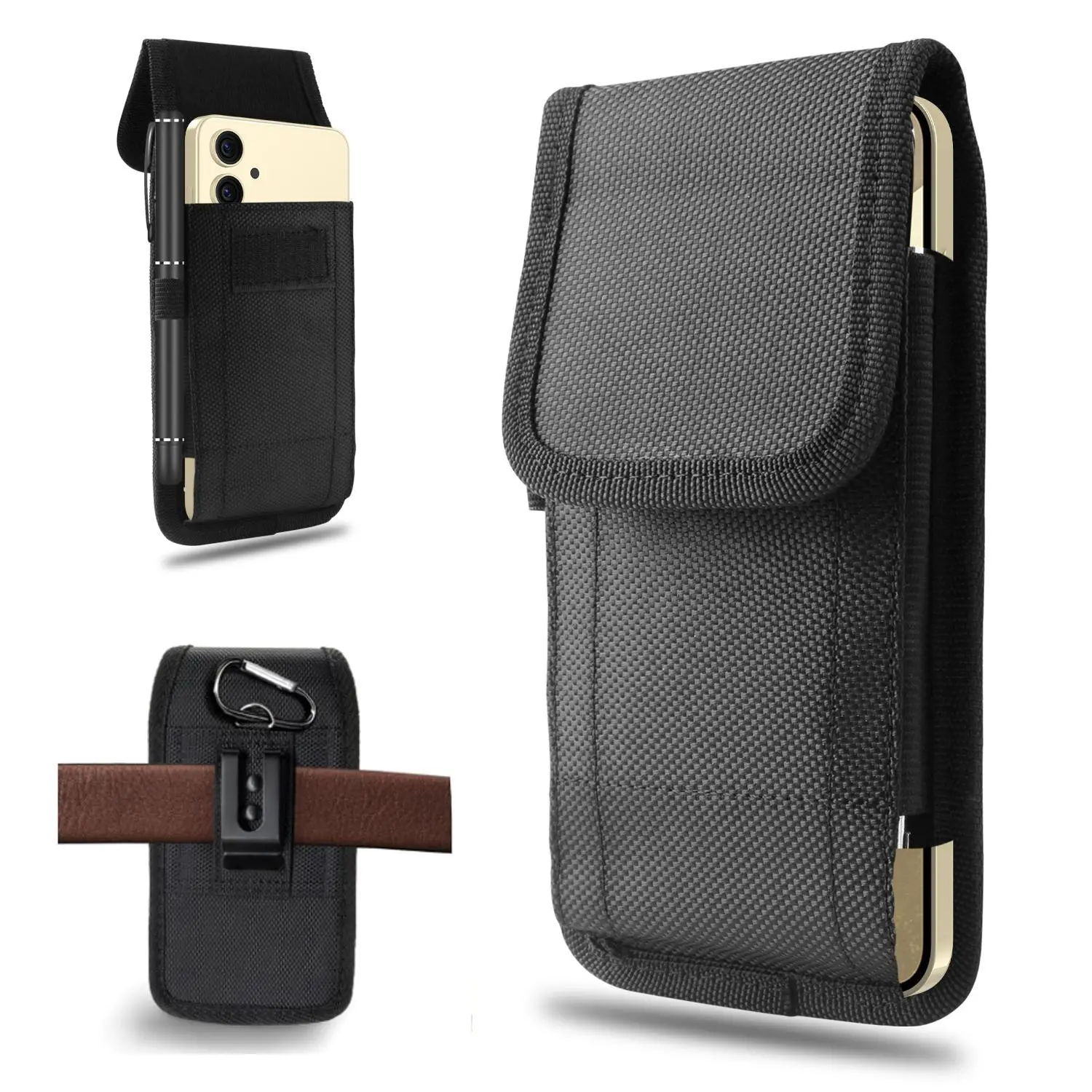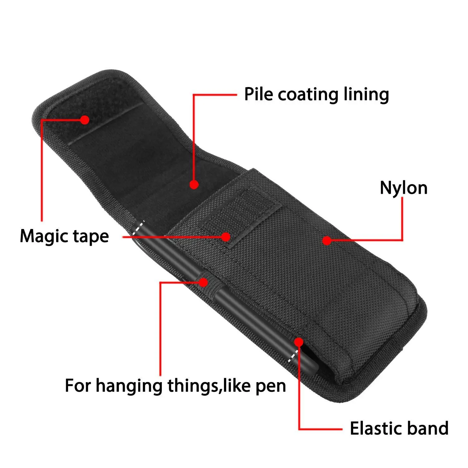 Design:Â The cell phone holster with a metal belt clip & belt loop & carabiner hook, Extra pen slot that can bring with pen, Flashlight pen,Voltage test pencil convenience.