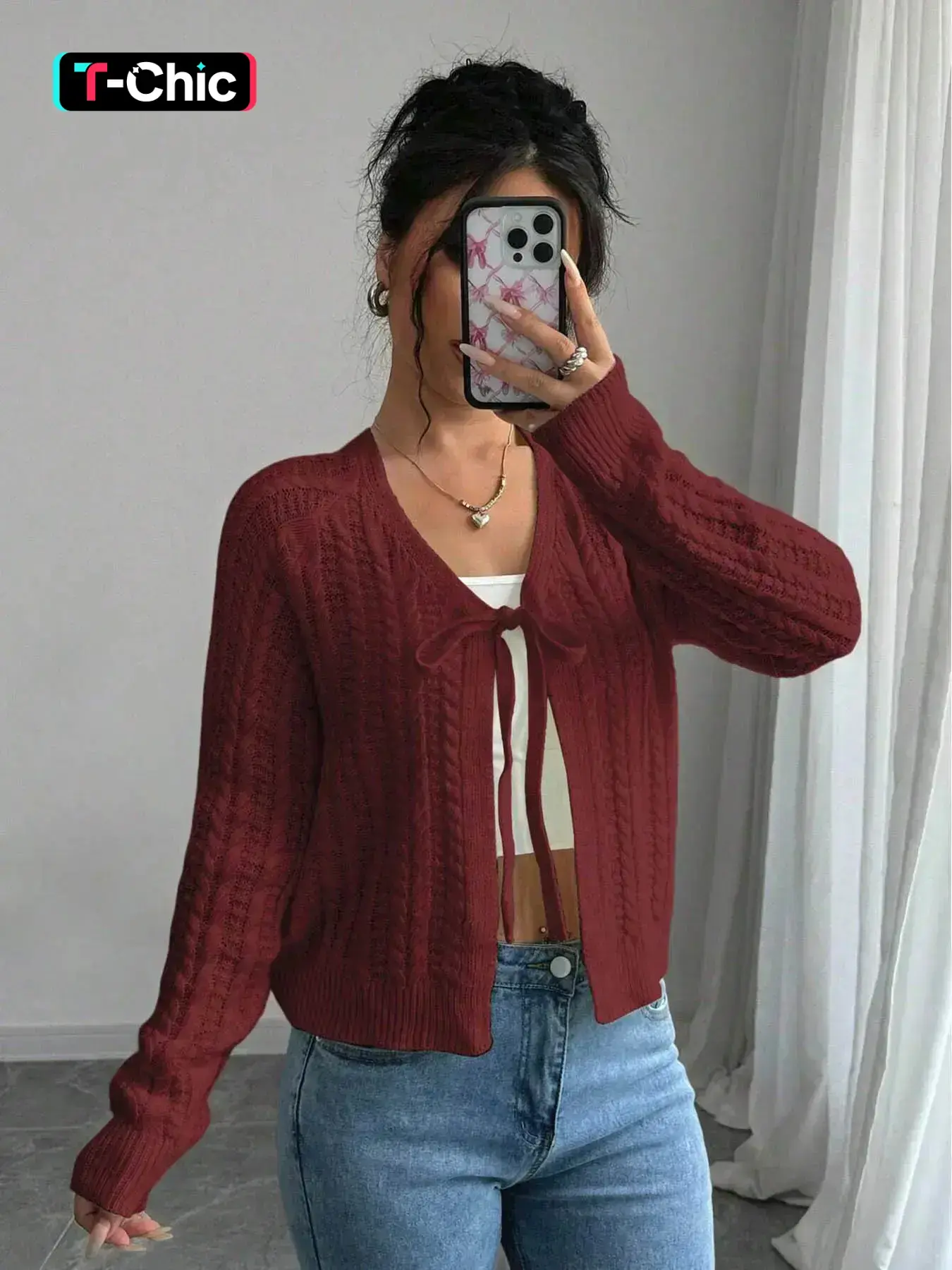 Women's Plain Tie Front Cable Knit Fitted Cardigan, Casual Long Sleeve Knitwear for Fall & Winter, Fashion Women's Knit Clothing for Daily Wear, Womenswear, Lady Knitting