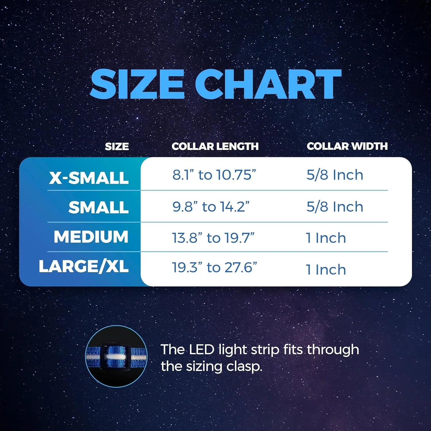 ·Pawesome Variety - Pick Your Style! From tiny tail-waggers to big barkers, we've got the perfect Blazin dog glow collar for every breed and personality. Choose your dog light up collar from 10 vibrant colors and 4 sizes (X-Small, Small, Medium or Large) - just check the size chart to find your fur-baby's match!