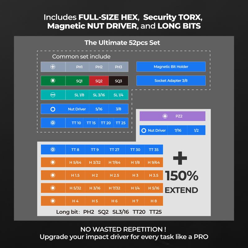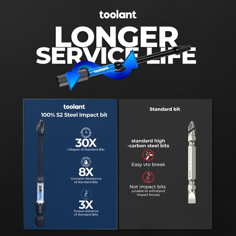 ·Impact-resistant bits: The toolant impact bits are crafted using impact-resistant materials, capable of withstanding high torque, reducing the risk of breakage, and extending the lifespan well beyond standard bits.; Manganese Phosphate surface to prevent rust.