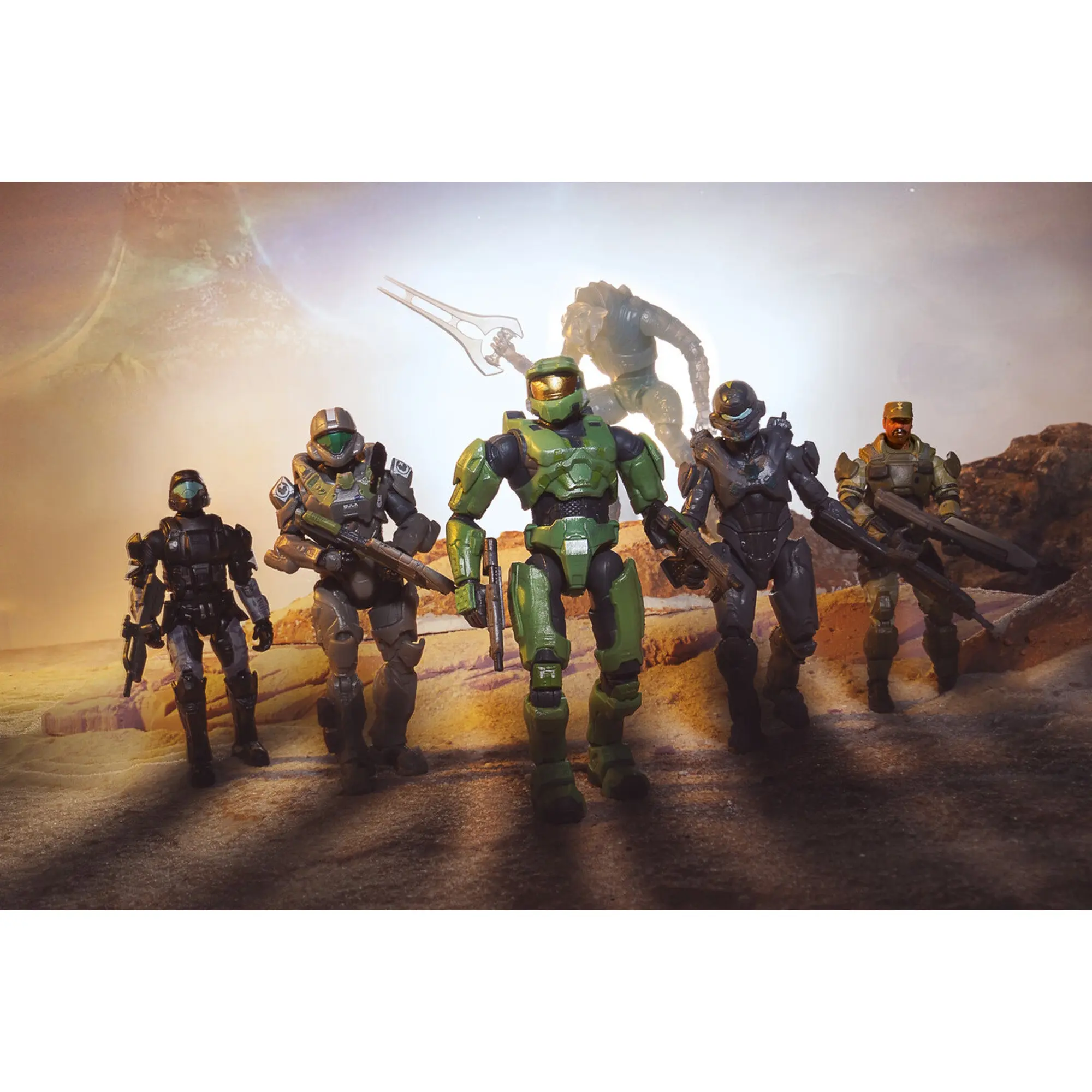 ·Lock and load with the Big Shot Box Battle Pack. This deluxe pack features six posable 4-inch action figures from the Halo Universe: Sgt. Johnson (Halo 3), ODST (Halo 3), Master Chief (Halo 2), Arbiter (Halo 3), Spartan Locke (Halo 5), and Spartan Buck (Halo 5).
