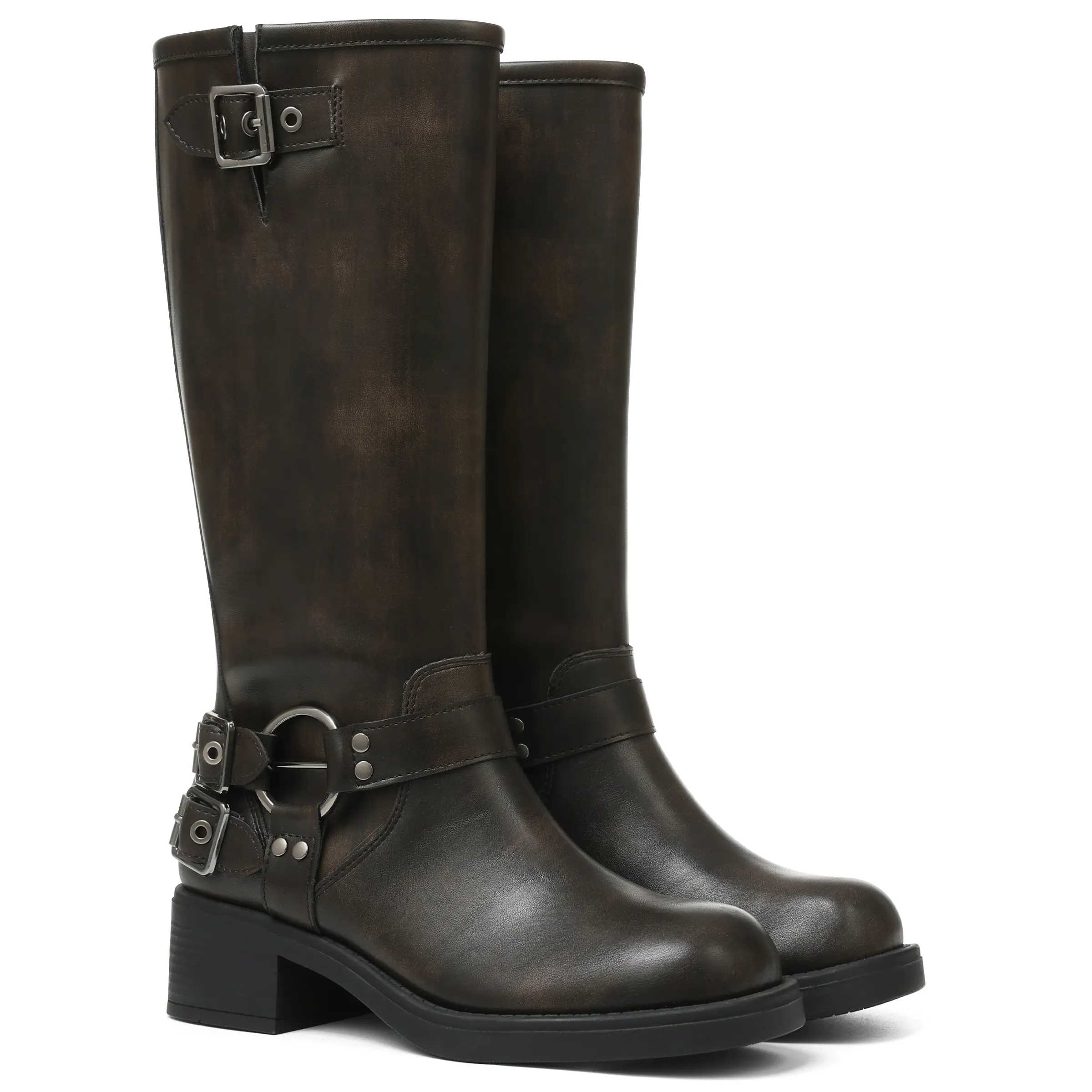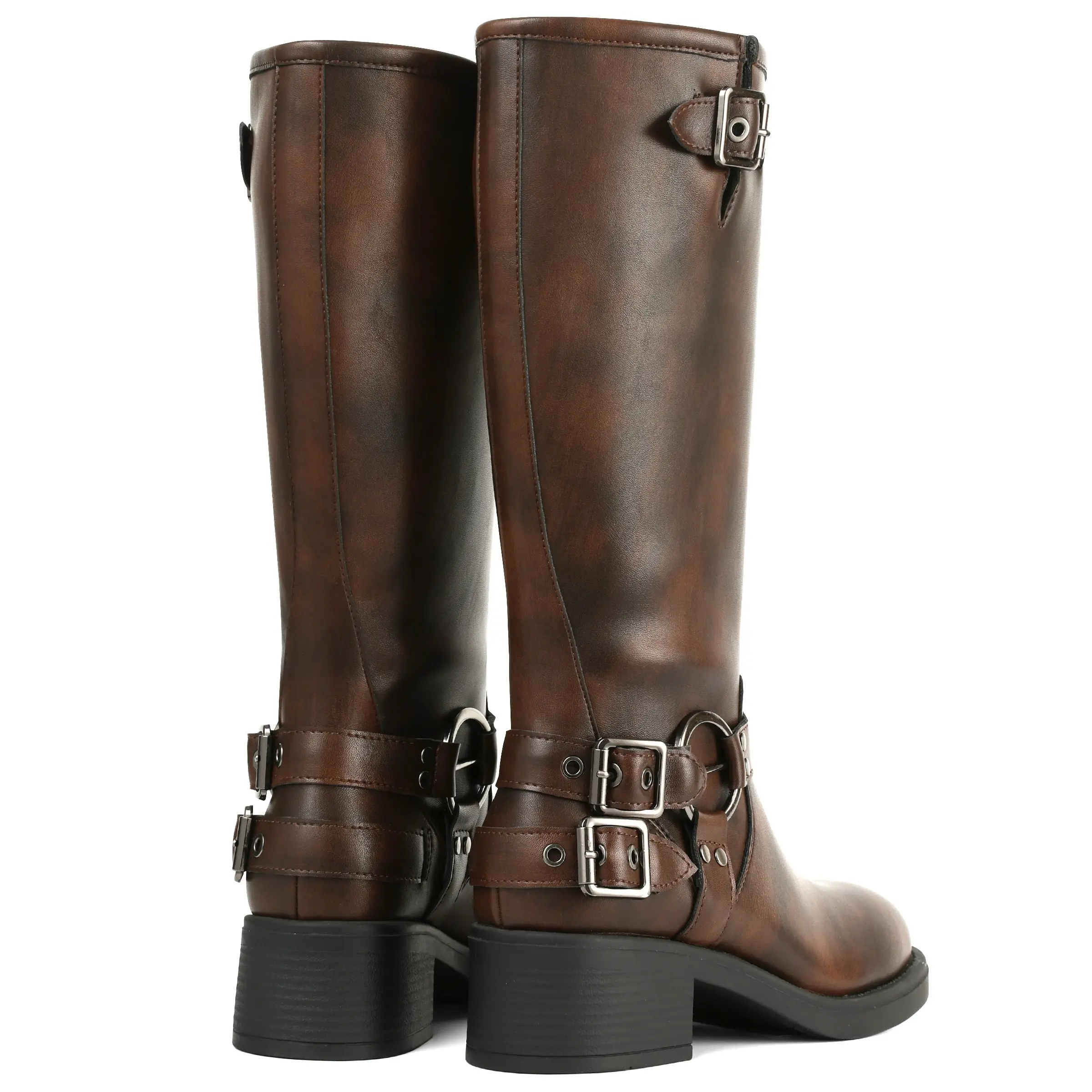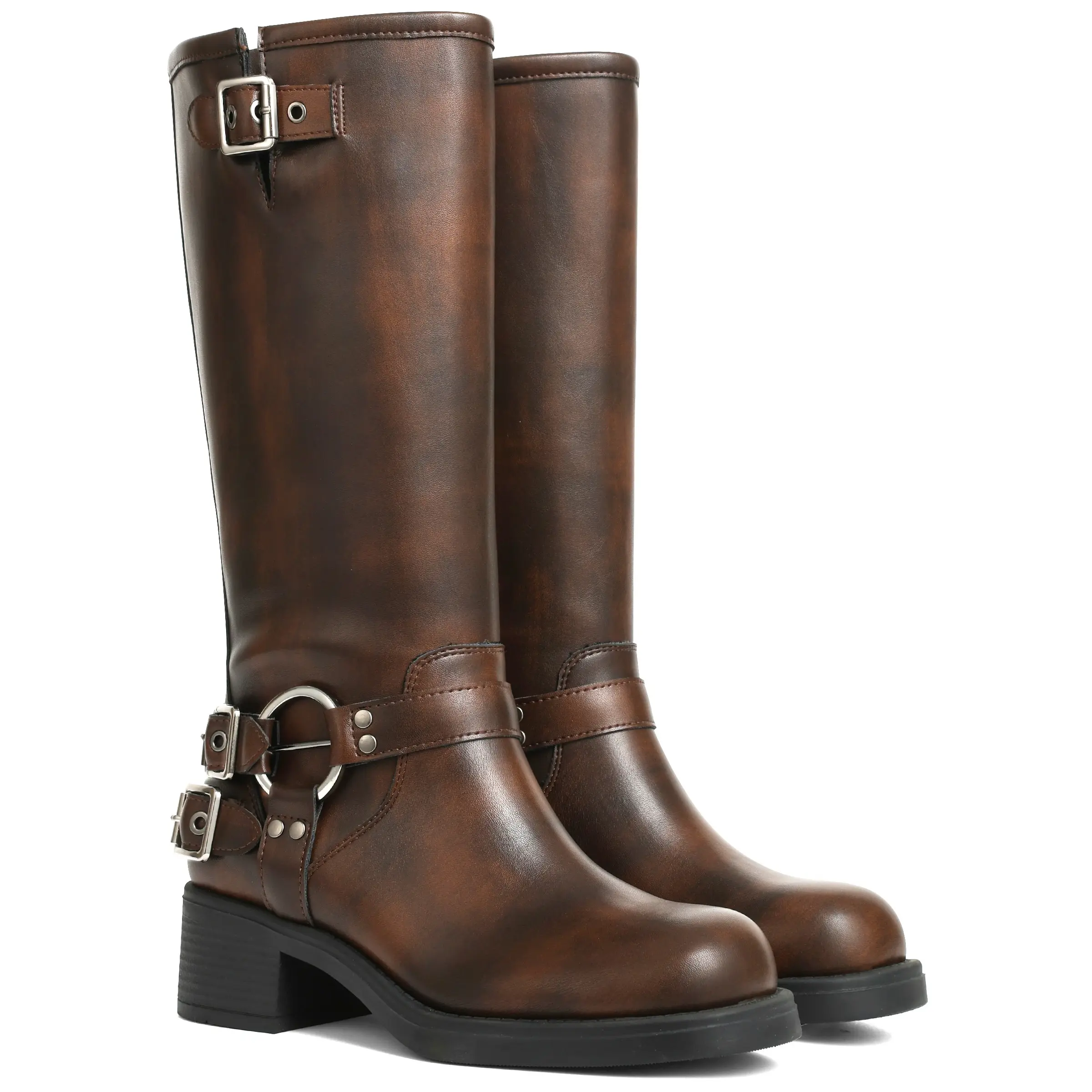 CYNLLIO Motor Cycle Combat Boots Women Round Toe Fashion Metal Buckles Chunky Block Heel Rivets Wide Calf Riding Boot Pull On Casual Vintage Dress Spring Rocky Boots Chunky Heel Vintage Riding Boots