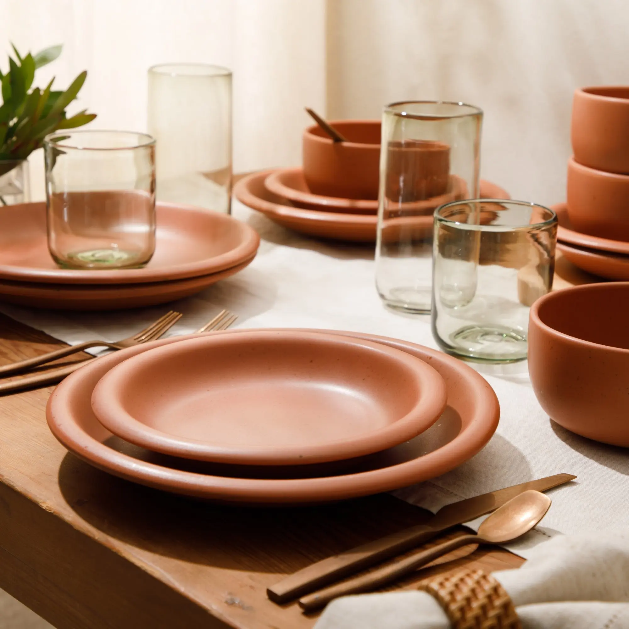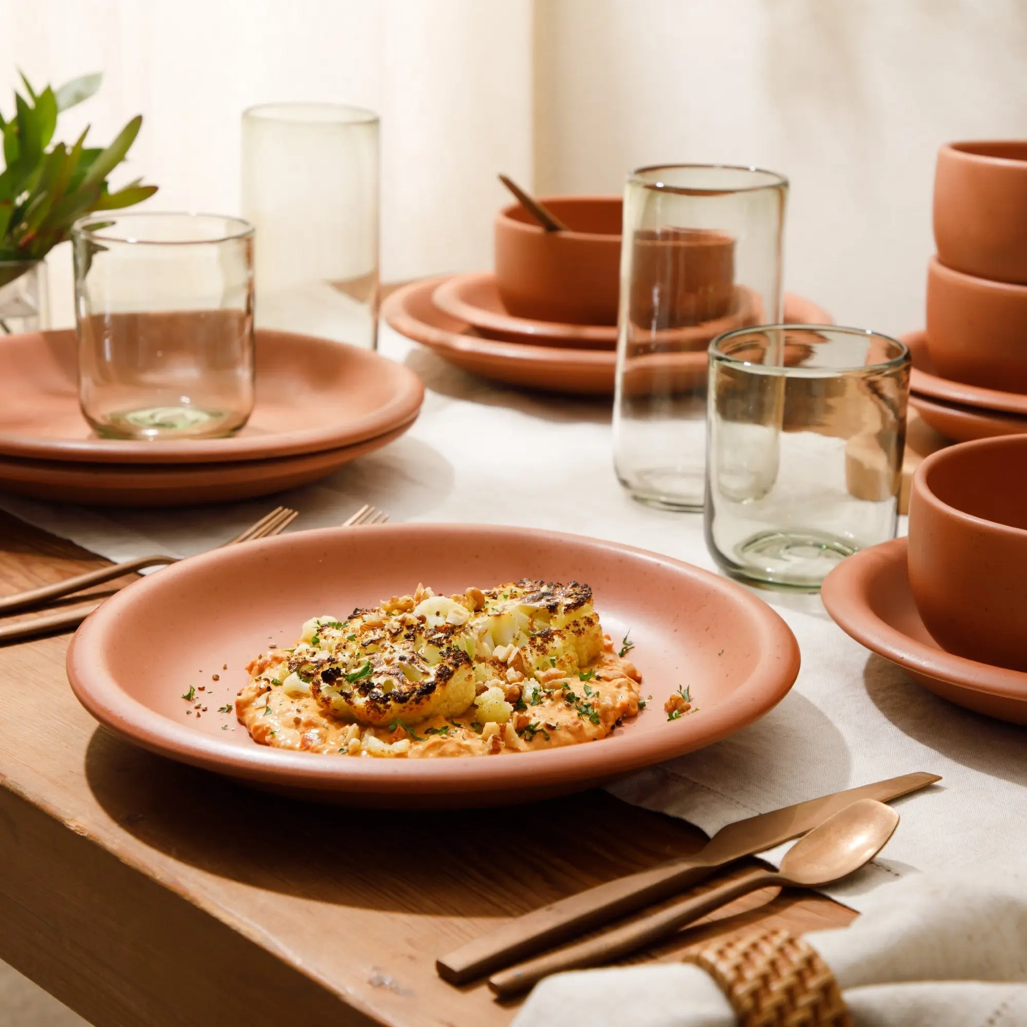 The bloomhouse® Corsica Clay Dinnerware Collection introduces elegant lines and bountiful proportions to complete an eclectic table that serves your favorite flavors. Artisanal-inspired stoneware plates and bowls feature intentional flecks from the reactive glaze finish to make them truly one-of-a-kind. As a nod to centuries-old ceramic traditions and modern design, this dinnerware collection borrows the art of making pieces by hand, turning sustainable clays into daily objects of affection. Suitable for a service for four, these pieces bring forth all the details that allow you to live mindfully and dine beautifully. Dishwasher and microwave safe.
