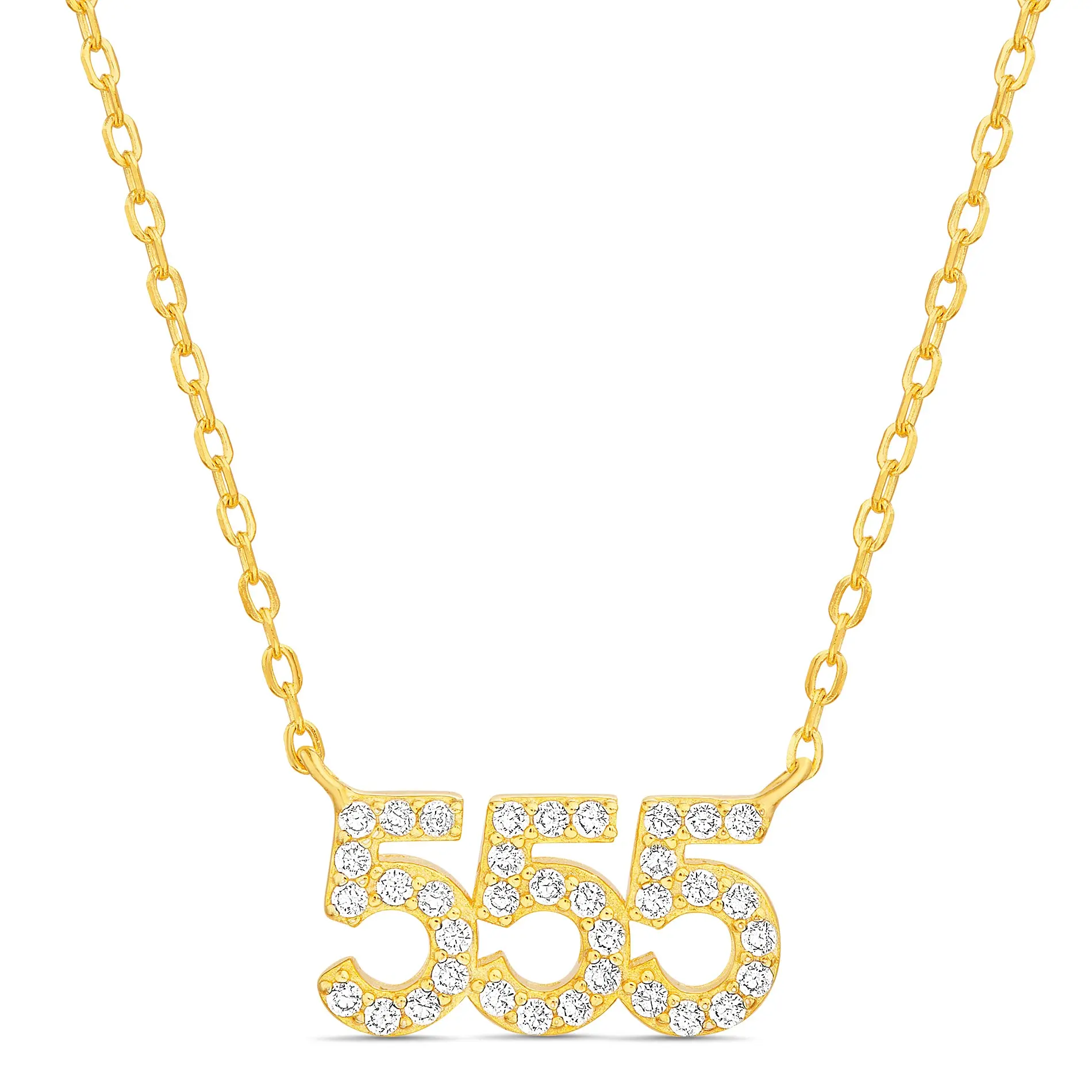 Elevate your look with the Sterling Silver Angel Number Necklace featuring number sequence 555. Finished with a sleek Yellow Gold plating and CZ stones, this elegant item is perfect for enhancing any outfit.
