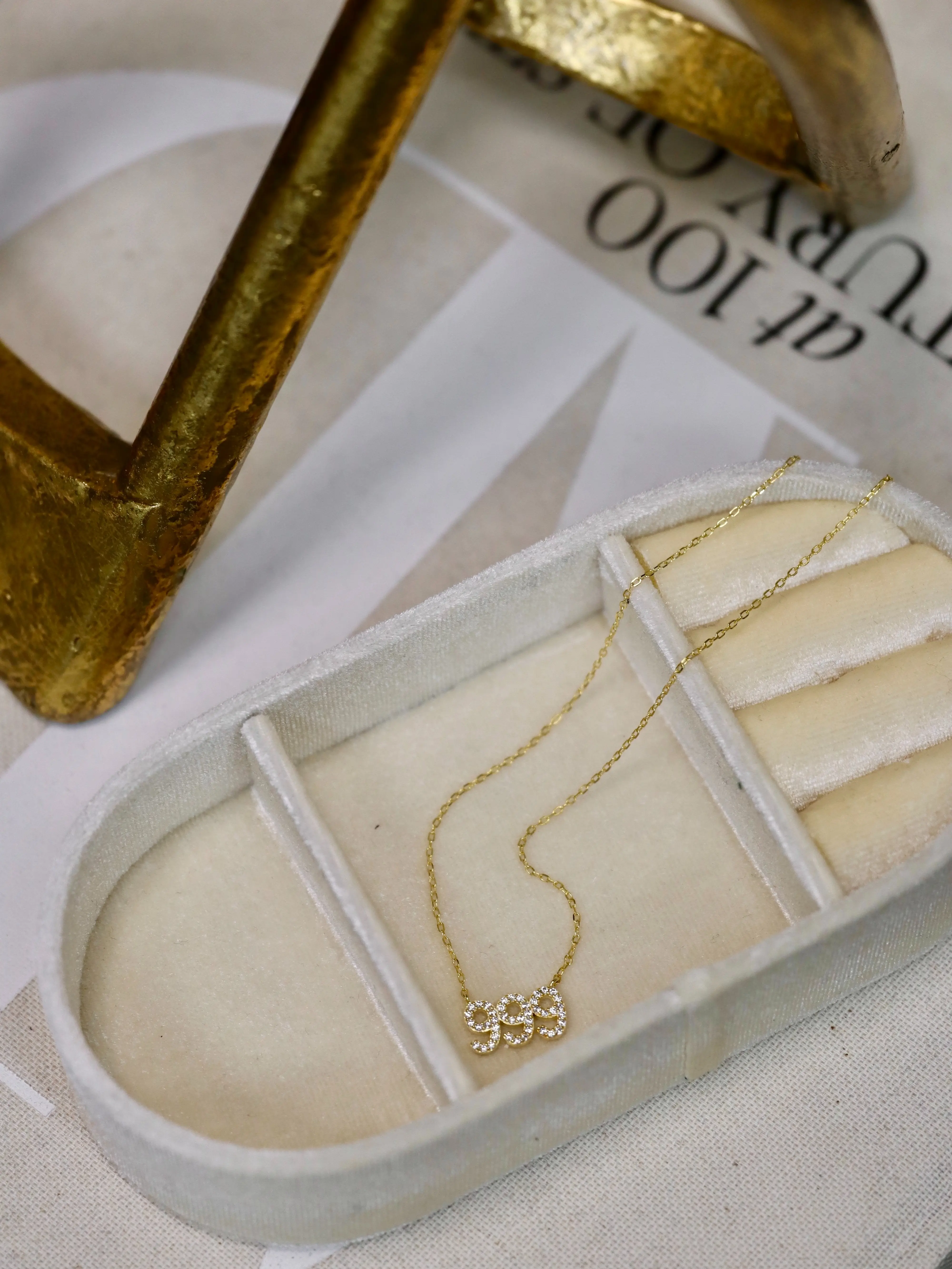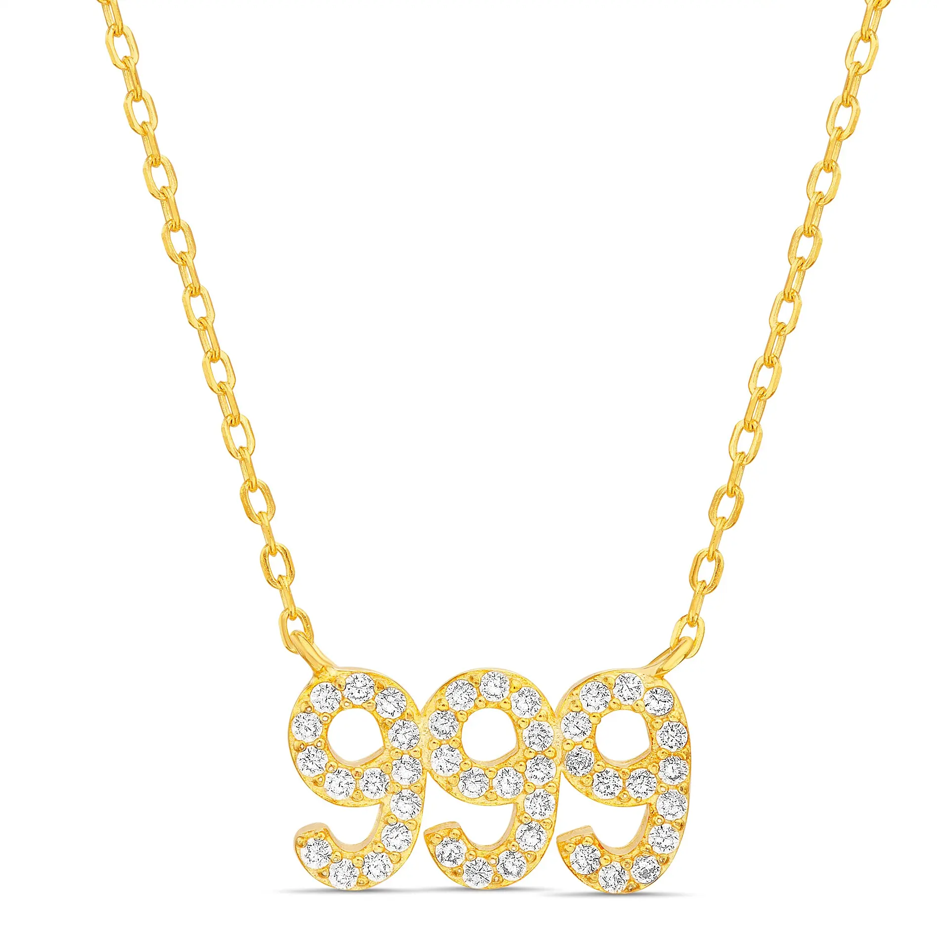 Brighten up your look with Sterling Silver Angel Number Necklace featuring number sequence 999. Finished with a sleek Yellow Gold plating and CZ stones, this necklace is perfect for any occasion!