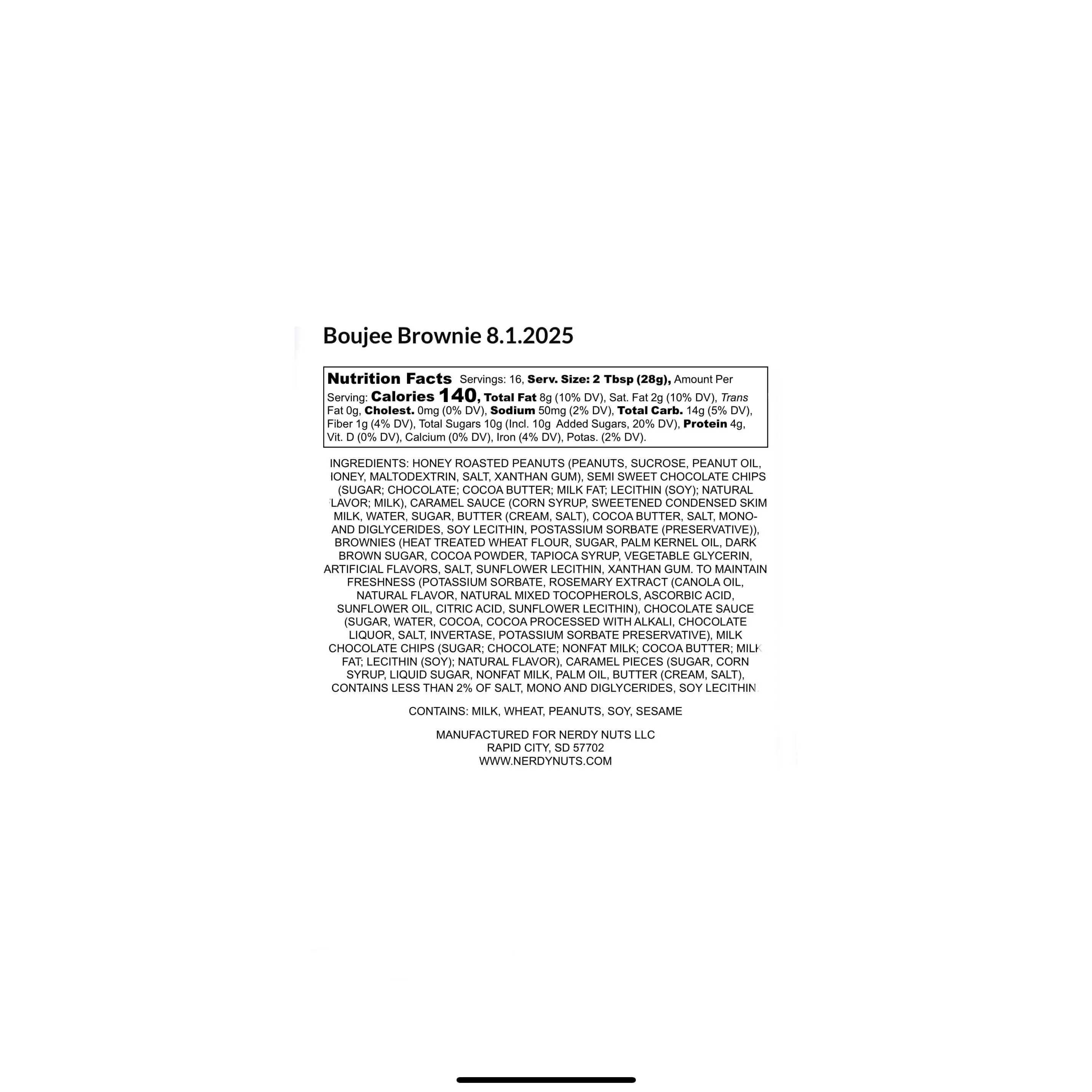 INGREDIENTS: HONEY ROASTED PEANUTS (PEANUTS, SUCROSE, PEANUT OIL, HONEY, MALTODEXTRIN, SALT, XANTHAN GUM), SEMI SWEET CHOCOLATE CHIPS (SUGAR; CHOCOLATE; COCOA BUTTER; MILK FAT; LECITHIN (SOY); NATURAL FLAVOR; MILK), CARAMEL SAUCE (CORN SYRUP, SWEETENED CONDENSED SKIM MILK, WATER, SUGAR, BUTTER (CREAM, SALT), COCOA BUTTER, SALT, MONO- AND DIGLYCERIDES, SOY LECITHIN, POSTASSIUM SORBATE (PRESERVATIVE)), BROWNIE BITES (MARGARINE (PALM OIL, WATER, SOYBEAN OIL, SALT, MONO- AND DIGLYCERIDES, COLORED WITH ANNATTO. CALCIUM DISODIUM EDTA ADDED AS A PRESERVATIVE, ARTIFICIAL BUTTER FLAVOR. VITAMIN A PALMITATE ADDED.), SUGAR, ENRICHED WHEAT FLOUR (WHEAT FLOUR, NIACIN, REDUCED IRON, THIAMINE MONONITRATE, RIBOFLAVIN, FOLIC ACID), FRUCTOSE, COCOA PROCESSED WITH ALKALI, WATER, BROWN SUGAR, NATURAL COCOA, WHOLE EGGS, PALM OIL AND SOYBEAN OIL (WITH ADDED SOY MONO- AND DIGLYCERIDES AND SOY LECITHIN), GLYCERINE, UNENRICHED WHEAT FLOUR, BAKING POWDER (SODIUM ACID PYROPHOSPHATE, SODIUM BICARBONATE, CORN STARCH, MONOCALCIUM PHOSPHATE), NATURAL FLAVORS (CONTAIN DAIRY COMPONENTS), SALT, POTASSIUM SORBATE (PRESERVATIVE)), CHOCOLATE SAUCE (SUGAR, WATER, COCOA, COCOA PROCESSED WITH ALKALI, CHOCOLATE LIQUOR, SALT, INVERTASE, POTASSIUM SORBATE PRESERVATIVE), MILK CHOCOLATE CHIPS (SUGAR; CHOCOLATE; NONFAT MILK; COCOA BUTTER; MILK FAT; LECITHIN (SOY); NATURAL FLAVOR), CARAMEL PIECES (SUGAR, CORN SYRUP, LIQUID SUGAR, NONFAT MILK, PALM OIL, BUTTER (CREAM, SALT), CONTAINS LESS THAN 2% OF SALT, MONO AND DIGLYCERIDES, SOY LECITHIN.