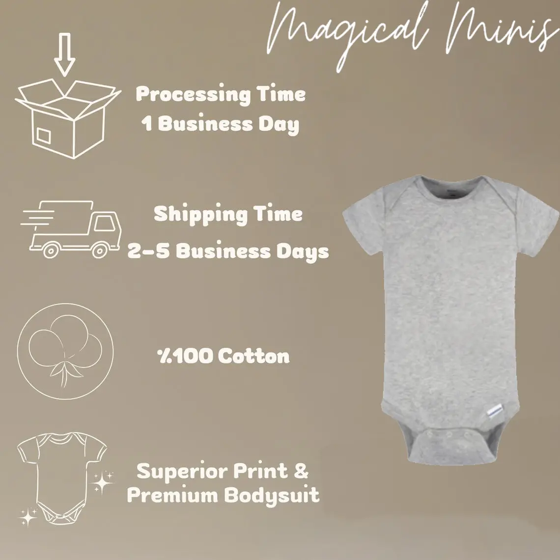 ·Welcome to Magical Minis Store, where we understand that your little one's skin needs special care. That's why our Baby Onesie and T-Shirt are made from 100% soft, skin-friendly cotton.