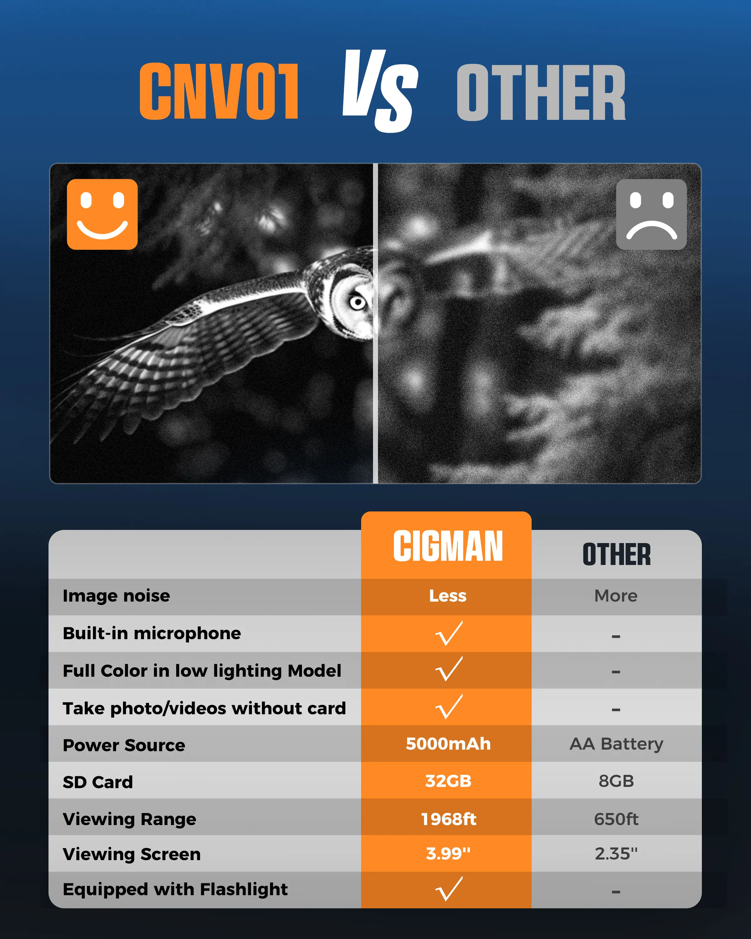 Powered by a 5000mAh rechargeable lithium battery, CNV01 infrared goggles offer up to 112 hours of continuous recording. We support memory expansion up to 512GB (including a 32GB TF card), providing ample storage for videos and images, with easy data transfer to computers via a data cable.