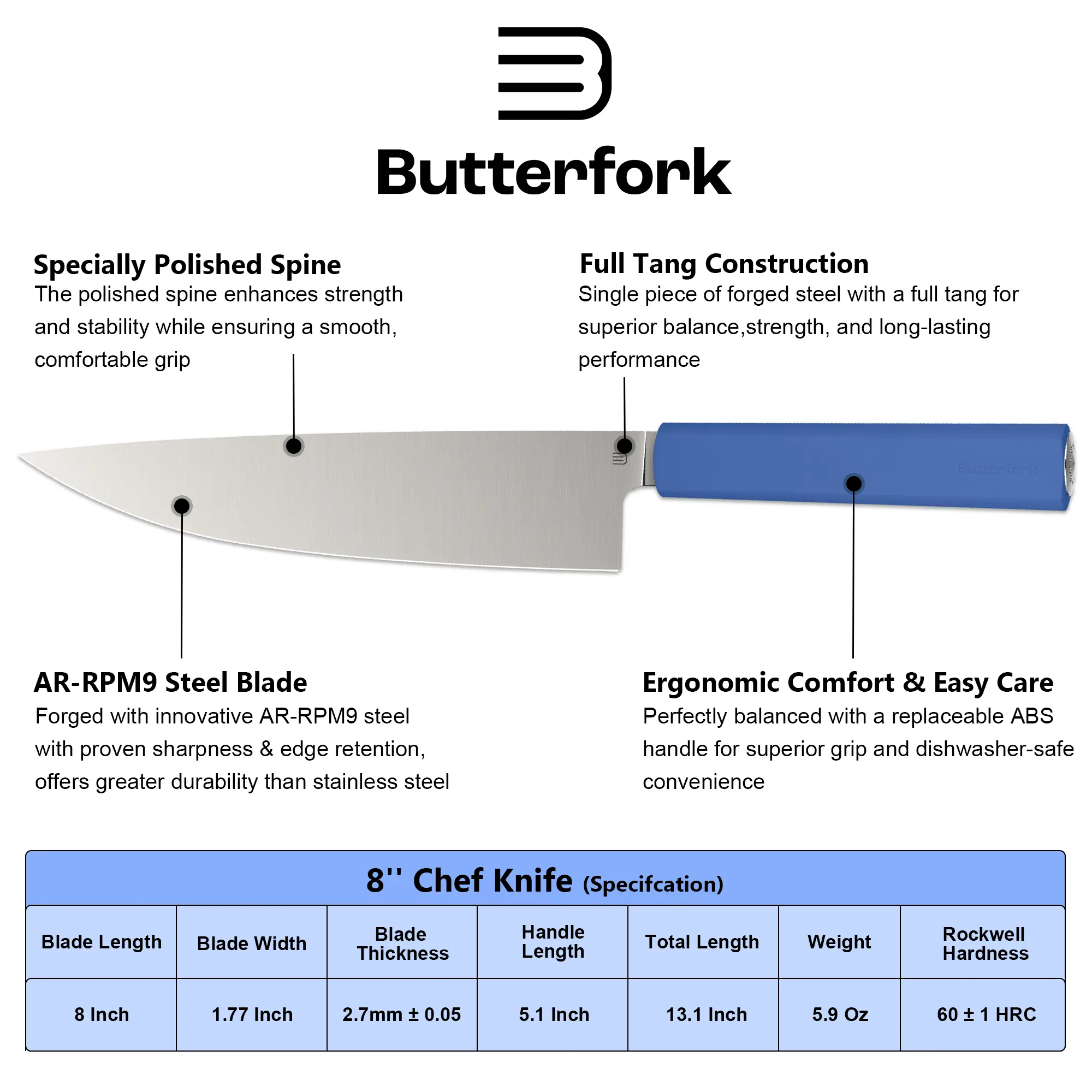·The Purest Chef's Knife is forged from AR-RPM9 Steel, offering a great balance of sharpedge retention and durability. This blade is designed to be sharper from the start and stays razor-sharp after 1,200+ cuts, outlasting ordinary blades by 2x – no more frequent sharpening hassles.