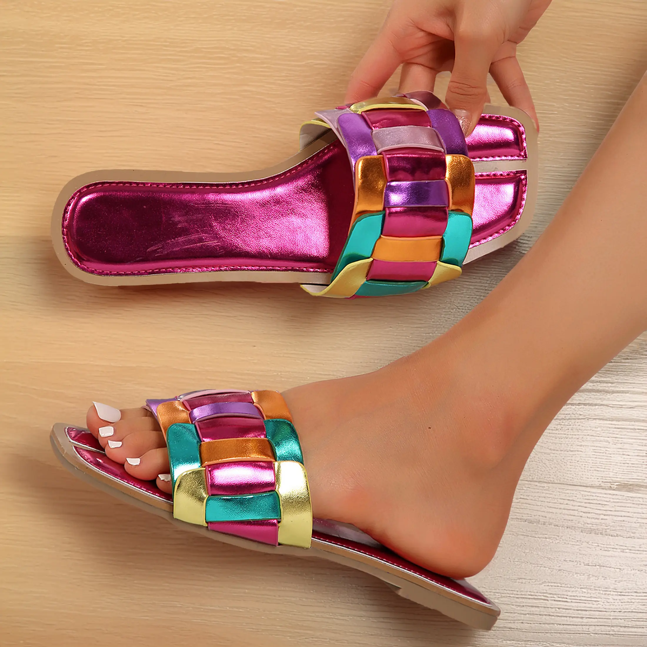 Colorblock Square Toe Sandals for Women - Open-Toed and Flat, Perfect for Summer Beach. Fashionable and Comfortable Women's Footwear.