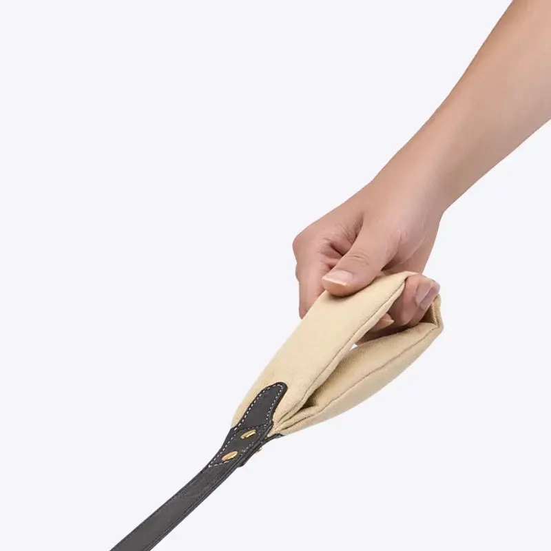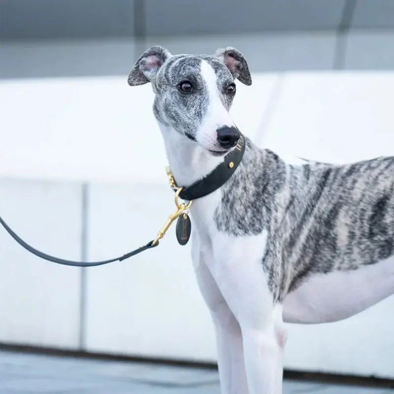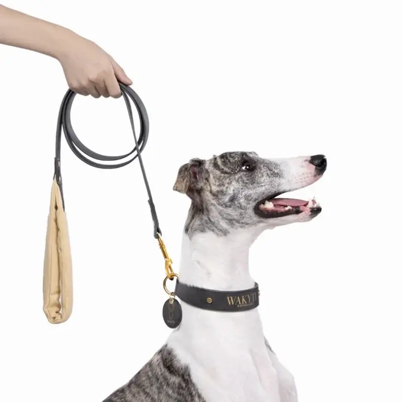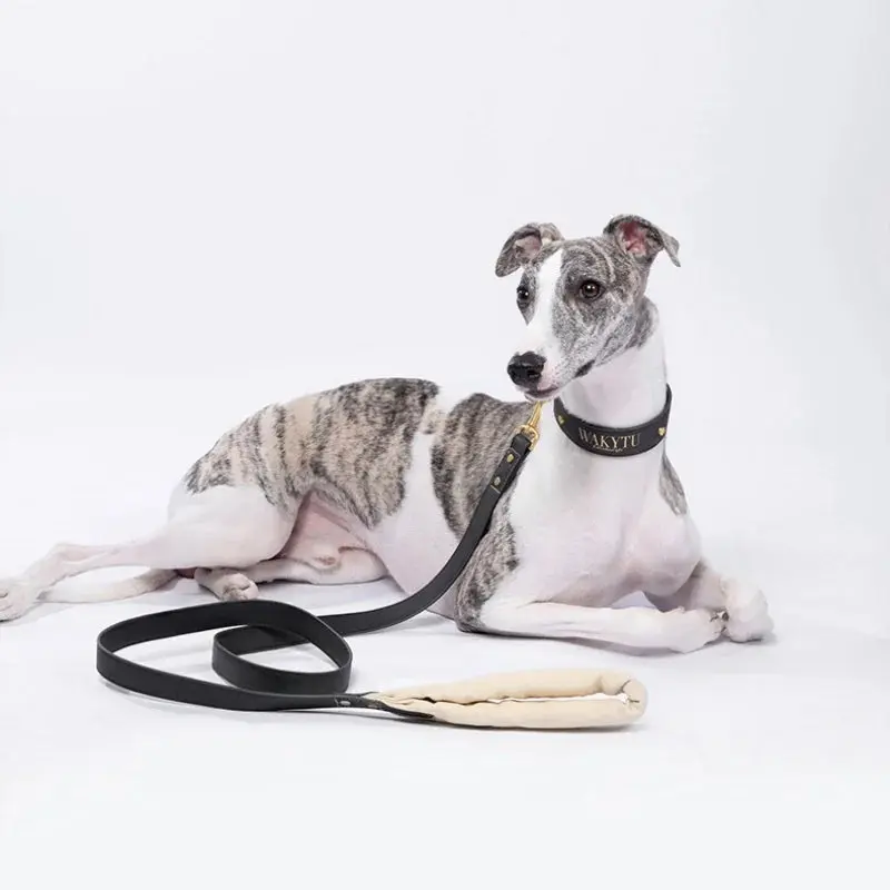 A Stylish leather collar and leash. Combining a beautiful asethic with functionality. A padded handle completes the leash providing support for your hands while allowing for a firm grip.