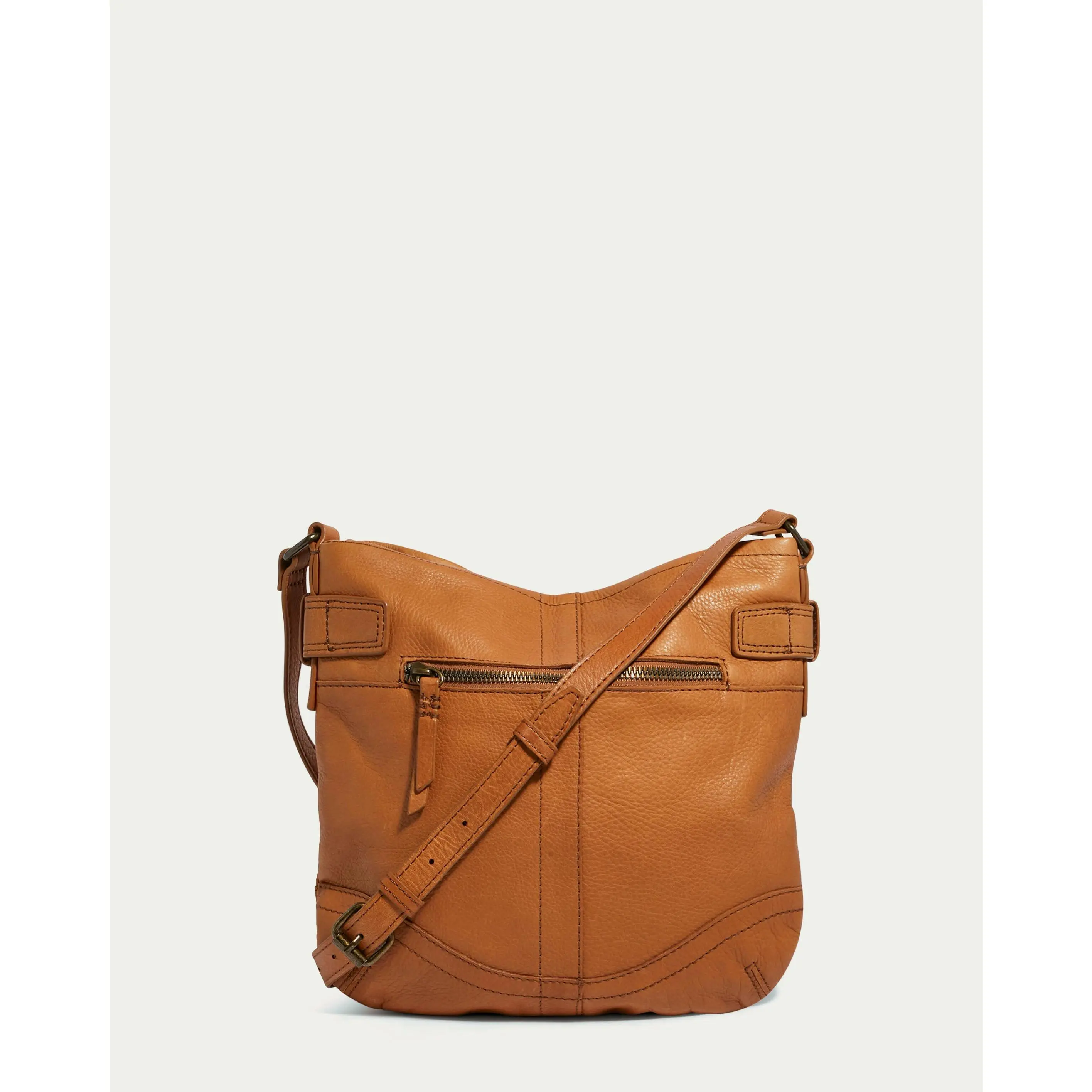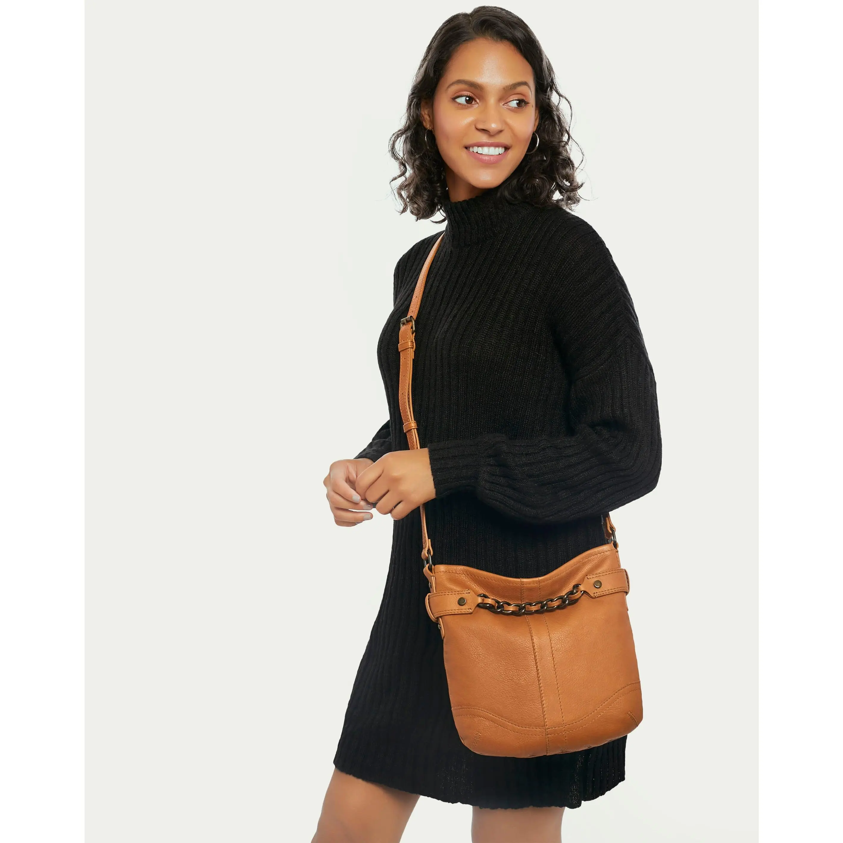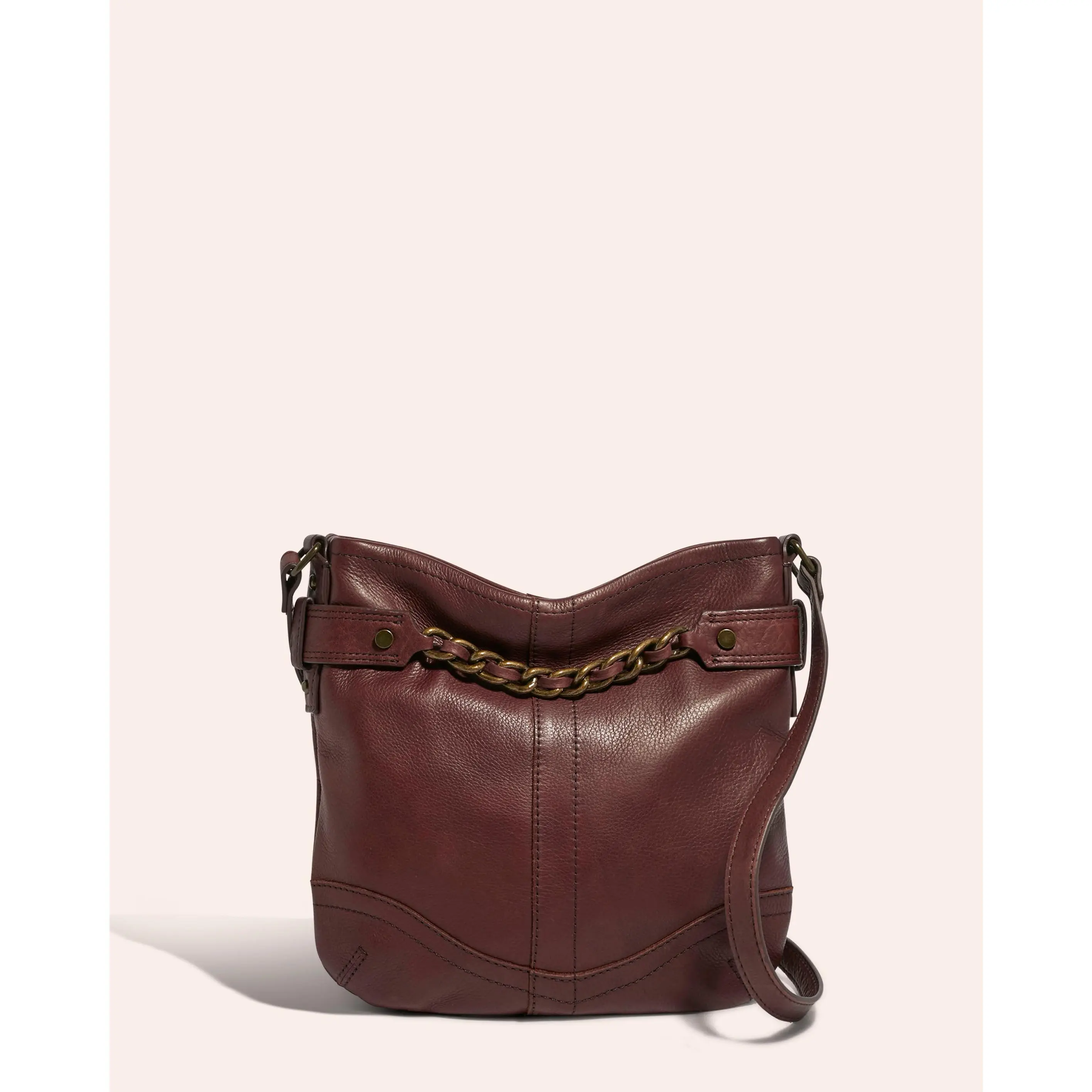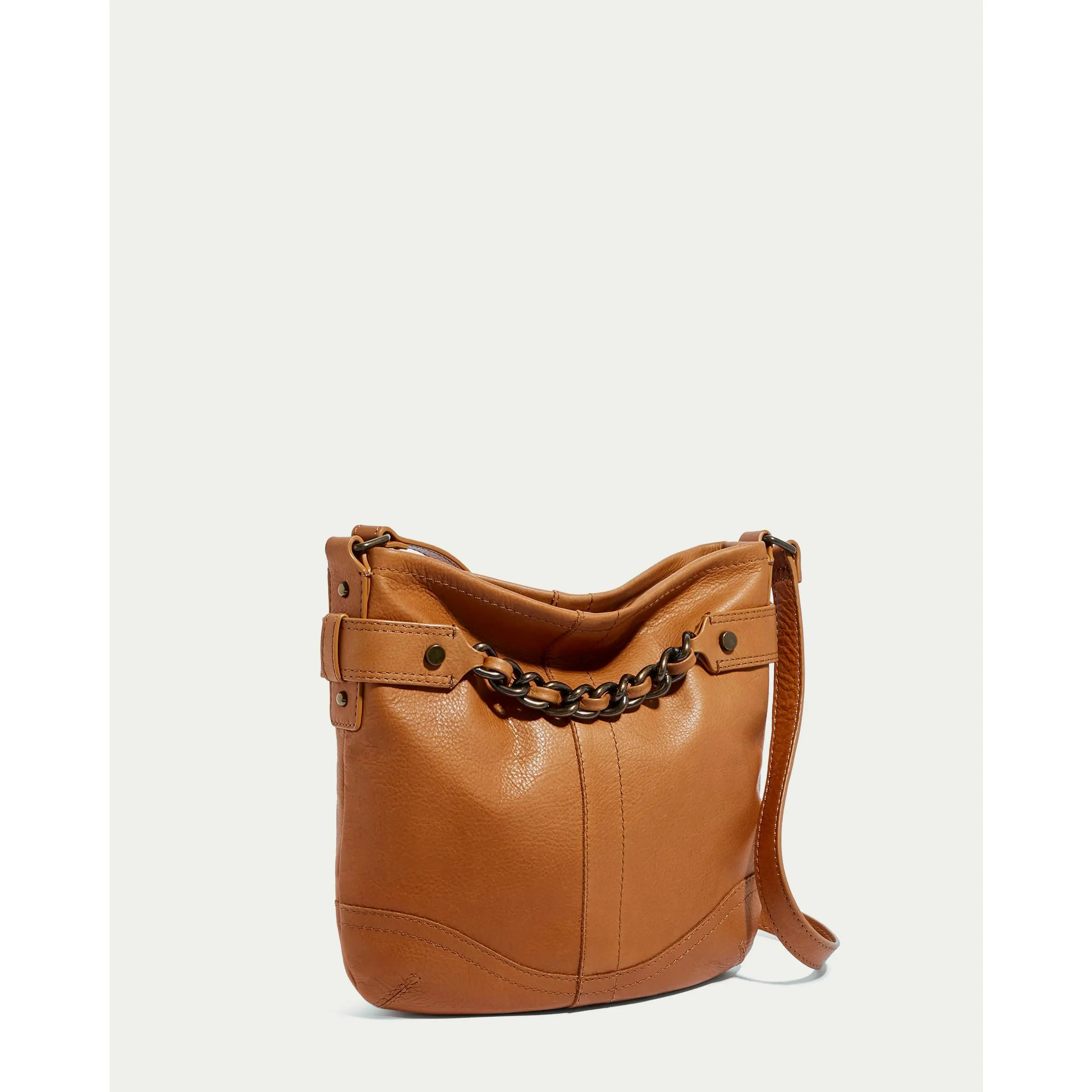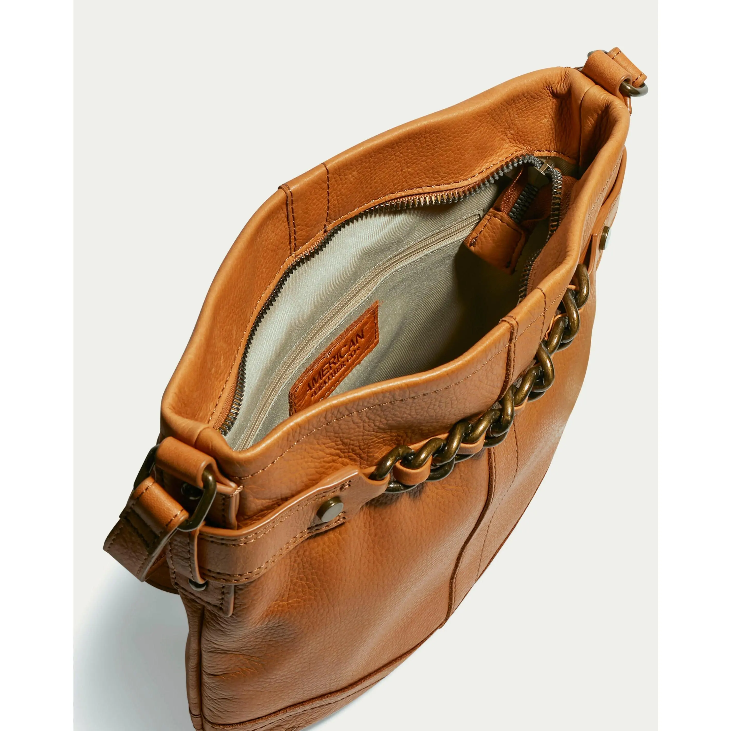 A classic, vintage inspired crossbody you will want to use every day! Design features include raw edge detailing, top rolled collar, raised flat studs and a chain link detail which is sure to get compliments. All the security you need is included as well with a full top zipper and a back zipper as well.