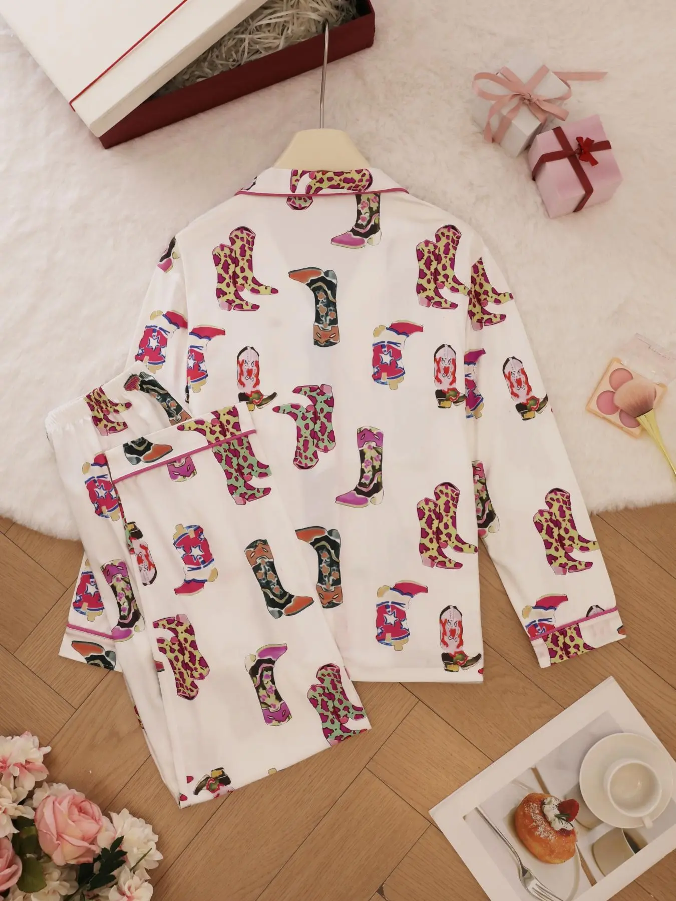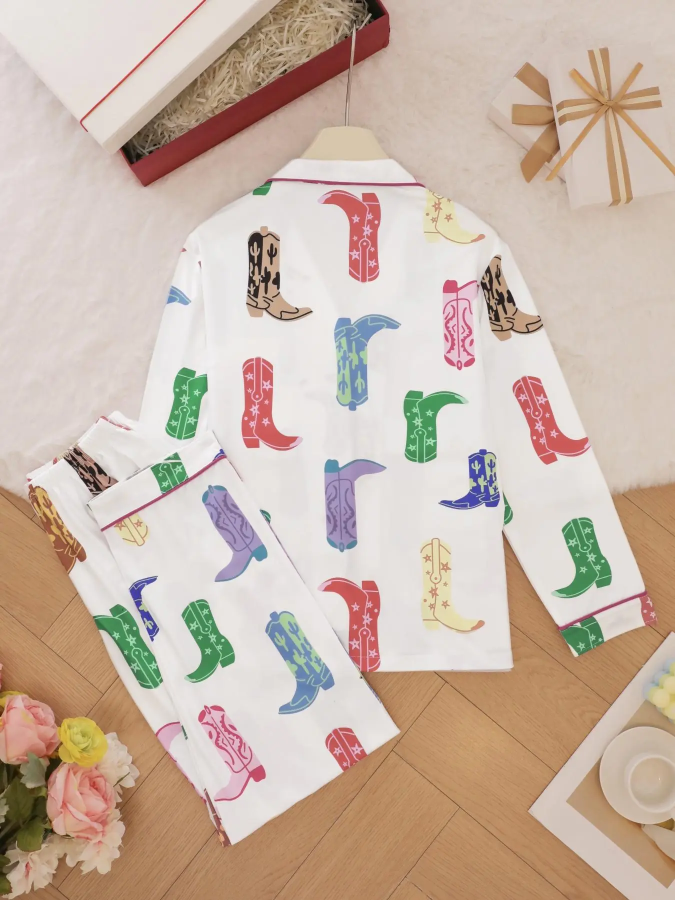 Women's Shoes Print Top & Pants Pyjama Set, Casual Comfy Long Sleeve Lapel Neck Top & Trousers Pyjama Set, Ladies Sleepwear for Spring & Fall, Casual Comfy Pajama