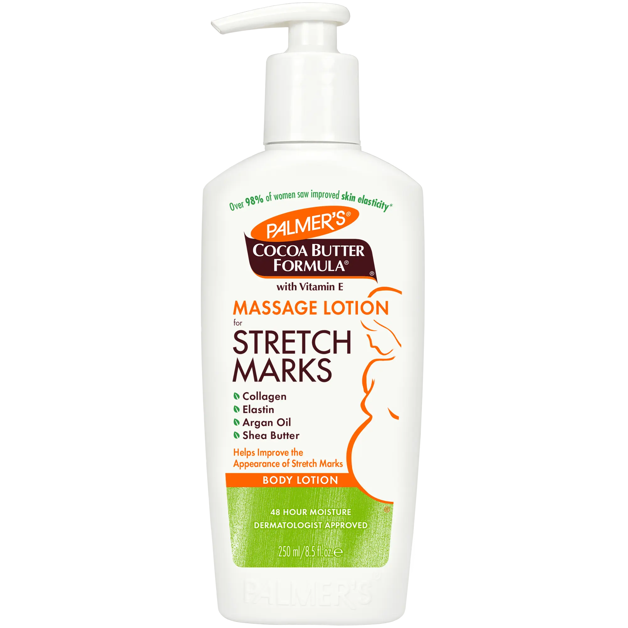 Help visibly improve skin elasticity and the appearance of stretch marks with Palmer's Cocoa Butter Formula Massage Lotion. Blending pure Cocoa Butter, Shea Butter, Natural Oils, Collagen, Elastin, and Lutein, this rich, non-greasy lotion is perfect for all-over-body use in place of your daily moisturizer to keep skin moisturized and supple for 48 hours, allowing skin to stretch more easily.