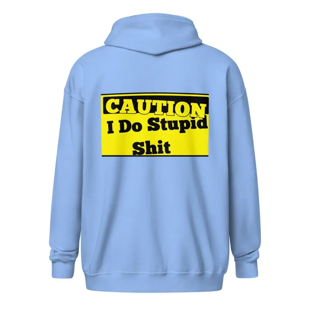 Make a bold statement with our Gildan Unisex Heavy Blend Zip Hoodie, featuring a striking 'CAUTION I Do Stupid Shit' sign on a plush fleece exterior. With premium metal zipper and front pockets, this hoodie offers unbeatable comfort and edgy style. Get yours now!